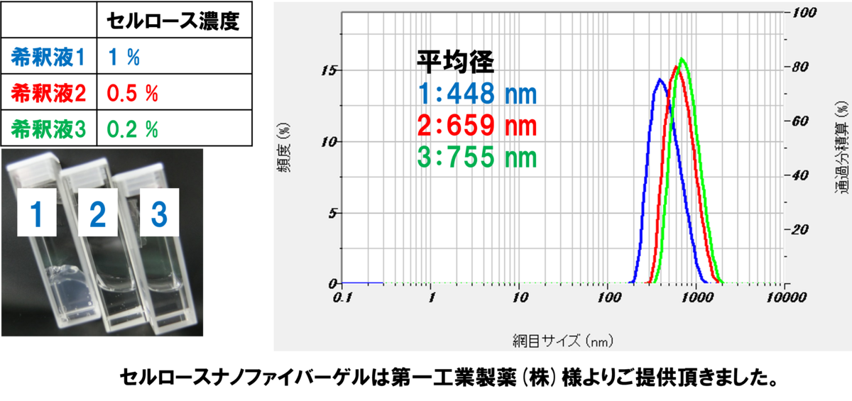希釈倍率の異なる化学解繊したセルロースナノファイバーゲルの網目サイズ分布を測定しました。