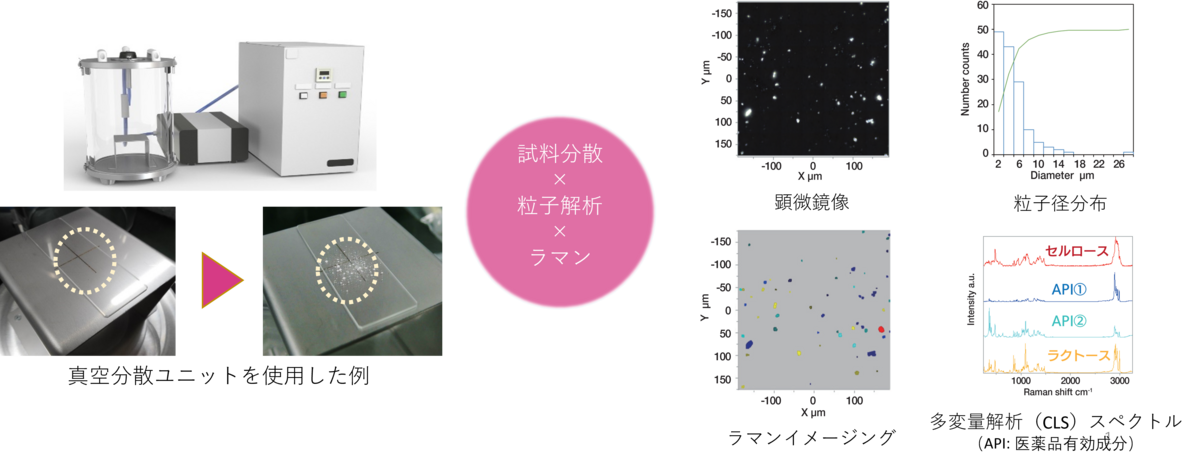 ■粉末試料を均一に分散し、粒子ごとの成分・結晶性や粒子径分布を解析 粉体の顕微観察において、粉体が均一に分散した試料を用意することは困難ですが、真空分散ユニットを使用することで容易に試料を均一に分散できます。その粒子を解析ソフト『Particle Finder』で位置座標検出し、自動で粒子ごとのラマン測定を実施することで、成分や結晶性ごとに分類された粒子データを取得することができます。また、粒子のアスペクト比、真円度などの統計パラメータから、粒子径分布のデータを併せて取得できます。