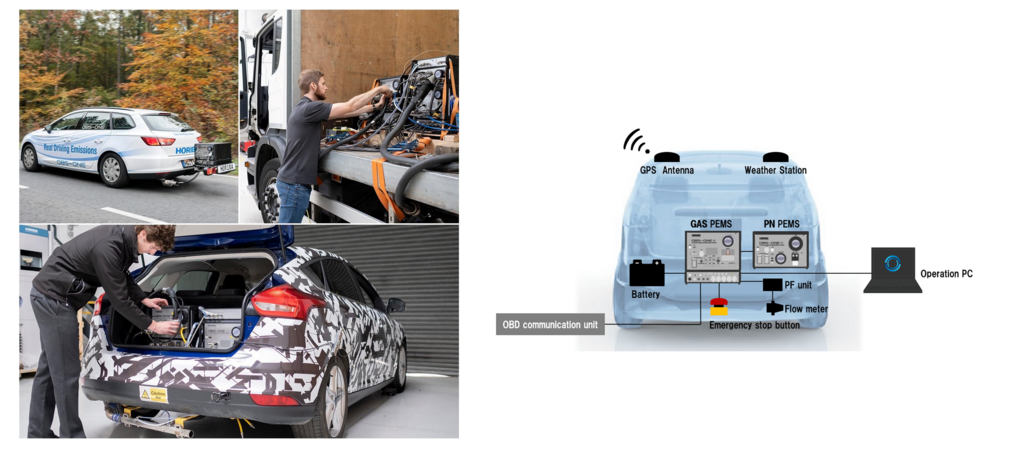 | 乗用車/貨物車 NRMM | 排出ガスなど | 濃度(CO、CO2、NO、NOx、THC) 排気質量流量 周囲湿度/温度/圧力 速度 緯度/経度/高度 エンジン燃料流量/冷却水温度/回転数/リアルタイムトルク エンジン吸入空気温度/オイル温度 故障状態/DPF再生状態/実際のギヤ 排出ガス温度 ペダル位置 | 分析計 EFM(Exhaust Flow Meter/排気流量計) 湿度計・温度計・圧力計 GPS、速度計またはECU GPS センサまたはECU センサまたはECU ECU 排気温センサ ECU | 路上走行時の排出ガス試験(JRDE) Euro_StageVまたは中国_国6試験 |