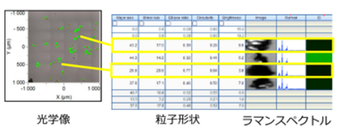 ウェハ上に分散した付着粒子を、顕微ラマン分光装置を用いて測定しました。画像解析機能を用いて粒子の検出をし、各粒子のラマンスペクトルを自動で測定。粒子形状の情報(面積・周囲長・アスペ クト比など)と合わせて、化学構造の解析が行えます。