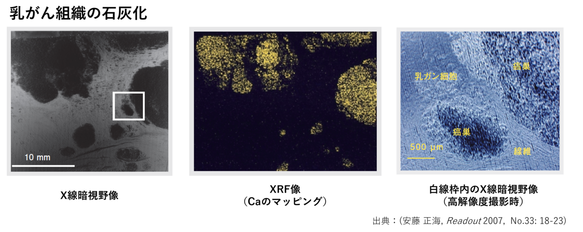 乳がんと石灰化の関係は、専門家の間でも注目を集め、研究が進められています。レントゲンやマンモグラフィなどで得られるX線暗視野像と、顕微鏡型XRFによる元素分析(Ca)を組み合わせることで、乳がん組織の石灰化を検出しました。