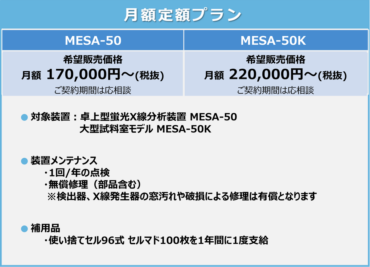 ・ MESA-50K:輸送費および引取作業として別途1か月分の使用料金を頂戴します。
