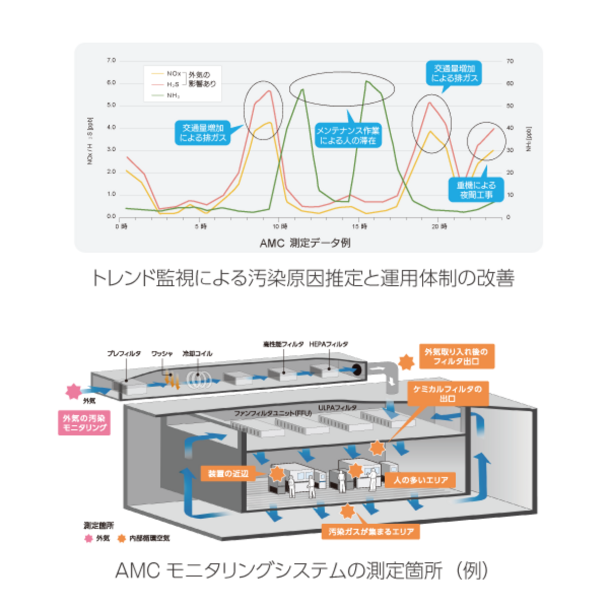クリーンルーム内のケミカル汚染を連続でモニタリングでき、汚染原因の推定と運用体制の見直しに役立ちます。