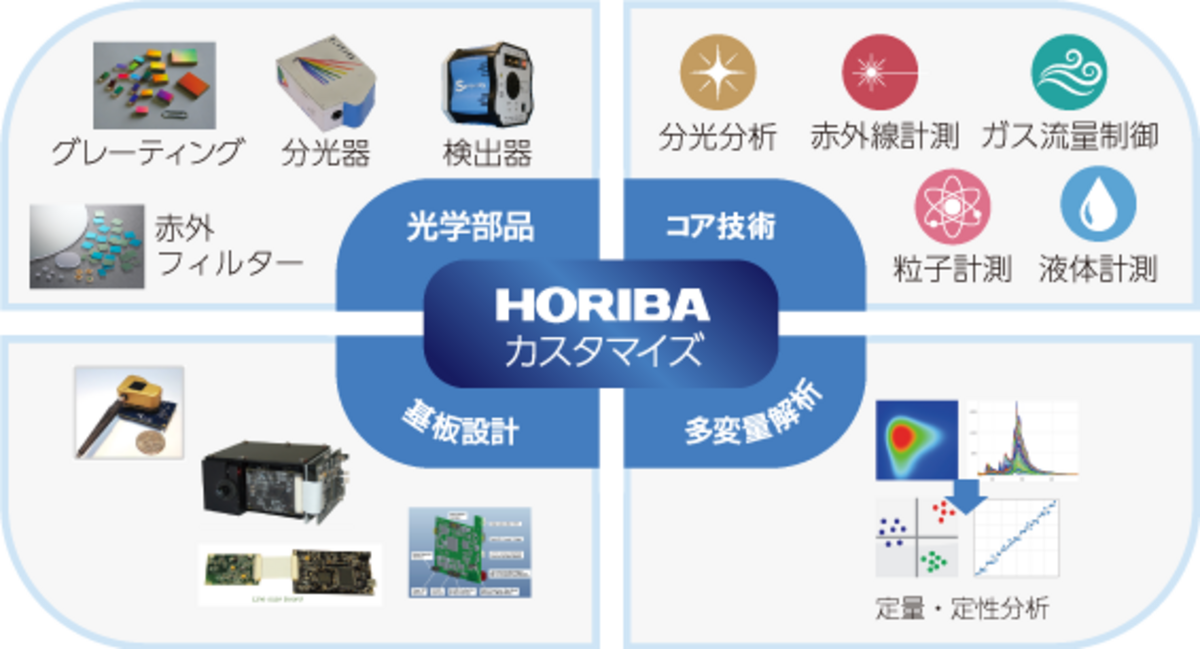 HORIBA は200 年を超える歴史を持つ分光技術を用いた光学部品、各産業分野で実績のある電気設計、多数のデータから目的の情報を抽出する多変量解析技術、そして独自のコア技術を有しています。