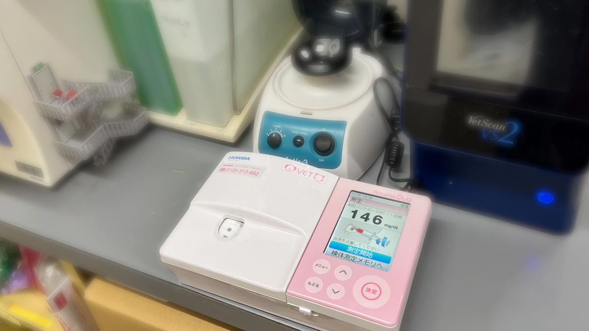 特に猫は採血時に興奮して血糖値が高く出ることがあるため、一時的な上昇なのか、以前から高血糖傾向(糖尿病の可能性)があるのかを見分ける判断材料にしています。血糖値が明らかに高い場合は尿検査も実施し、尿糖の有無などを確認したうえで、糖尿病かどうかを最終的に判断しています。