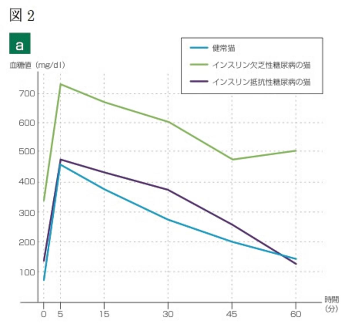 猫の糖尿病は2つに分類され、先述しましたように人の2型糖尿病に類似するものを、インスリン抵抗性糖尿病、そしてインスリンの分泌が枯渇しているものを、インスリン欠乏性糖尿病といいます。前者は、インスリンの自然分泌が認められるものの、食後血糖値の上昇や血糖値の下降状況が著しく遅延したりする病態を示します。それら原因として、基礎疾患の影響により、様々な臓器におけるインスリンの反応(作用)の遅延が起こることで、血糖値の上昇が起こることが明らかになっています。猫の糖尿病は、基礎疾患→インスリン抵抗性→インスリン欠乏性の順番に病態を亢進させていくため、早期に基礎疾患を発見し、そしてインスリン抵抗性糖尿病の診断、寛解への糖尿病治療が非常に重要になってくるのです。そこで、今回ご紹介するのが、インスリン抵抗性糖尿病の診断方法として、私が利用しているのが経口・静脈糖負荷試験です(図2)。