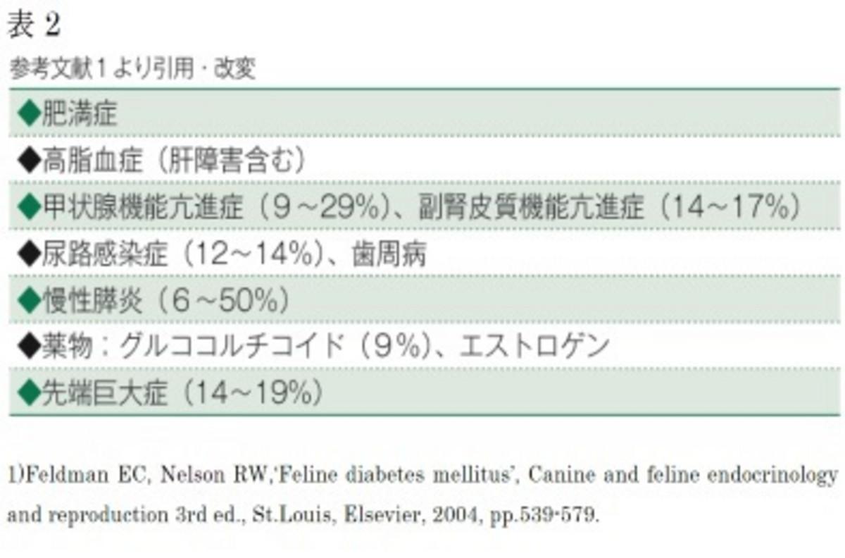 最後に、猫の糖尿病を発症させる基礎疾患のご紹介です。猫で多く知られている基礎疾患の一つに慢性膵炎が挙げられますが、多くの文献では慢性膵炎以外にも、表2のように様々な疾患が猫の糖尿病の基礎疾患になり得ることが明らかになってきています。猫の糖尿病は、人と類似しておりインスリン非依存型糖尿病(2型糖尿病)に分類されていますが、人の2型糖尿病も慢性的な基礎疾患が原因で糖尿病を発症することが明らかになっていることからも、猫の糖尿病を発症させる基礎疾患の検索こそ、予防的に糖尿病を発症させないためにも重要なことであると考えています(表3)。