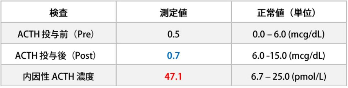 ACTH投与後コルチゾールは0.7 mcg/dLであったことから、副腎皮質機能低下症が診断されました。また下垂体機能不全による続発性(二次性)非典型的副腎皮質機能低下症の可能性を除外する為に、内因性ACTHを測定したところ、結果が47.1 pmol/L(正常値:6.7-25.0)であったことから続発性非典型的副腎皮質機能低下症の可能性は除外されました(表3)。