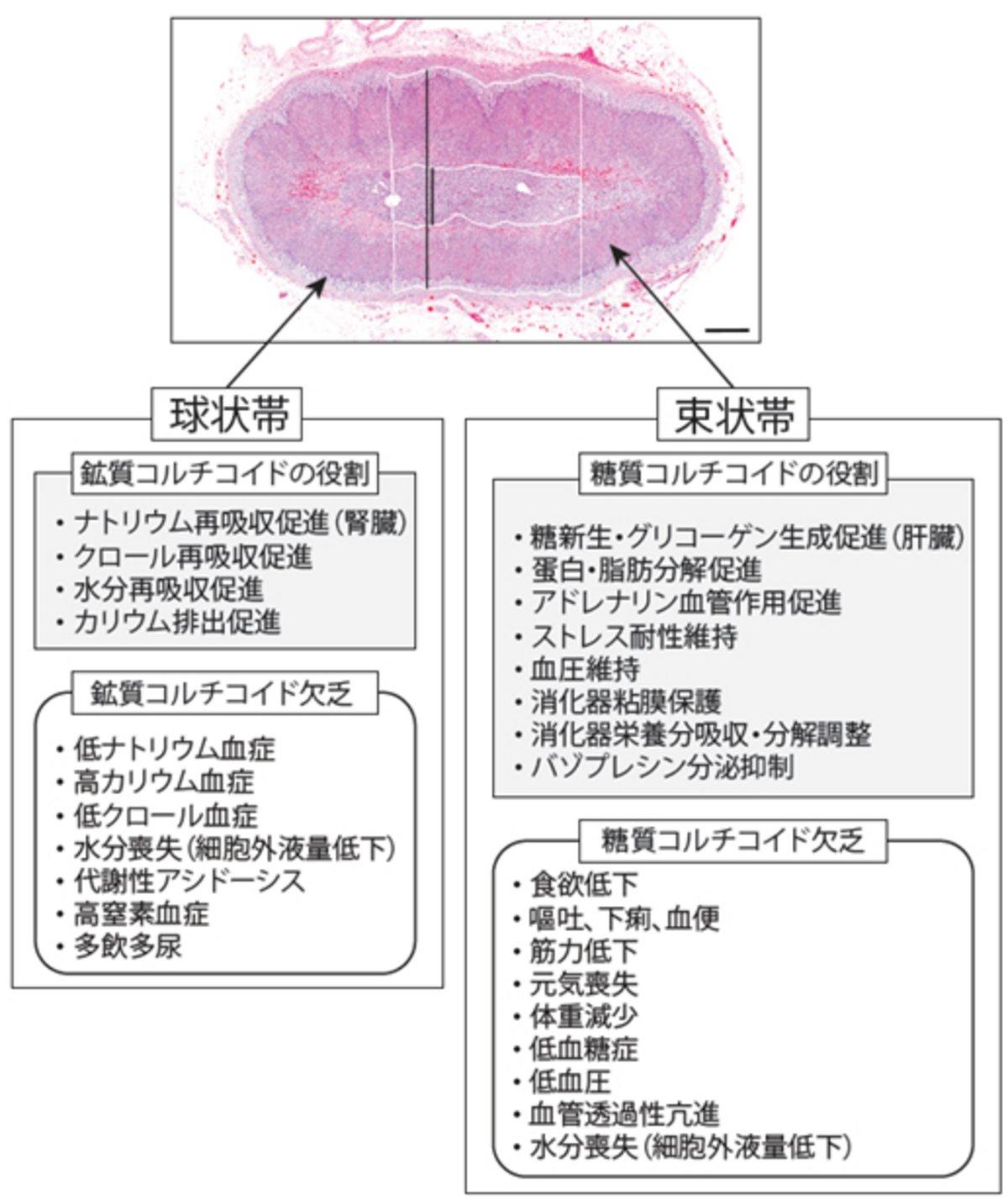 図1:鉱質コルチコイドと糖質コルチコイドの役割と欠乏時に見られる主な症状。写真は正常な副腎皮質組織断面図。写真内の外側白線と長黒線は分泌領域、内側白線と短黒線は髄質部を指している。(副腎皮質組織断面図は、Frank CB, et al. Correlation ofinflammation with adrenocortical atrophy in canineadrenalitis. J Comp Pathol. 2013;149:268から抜粋)