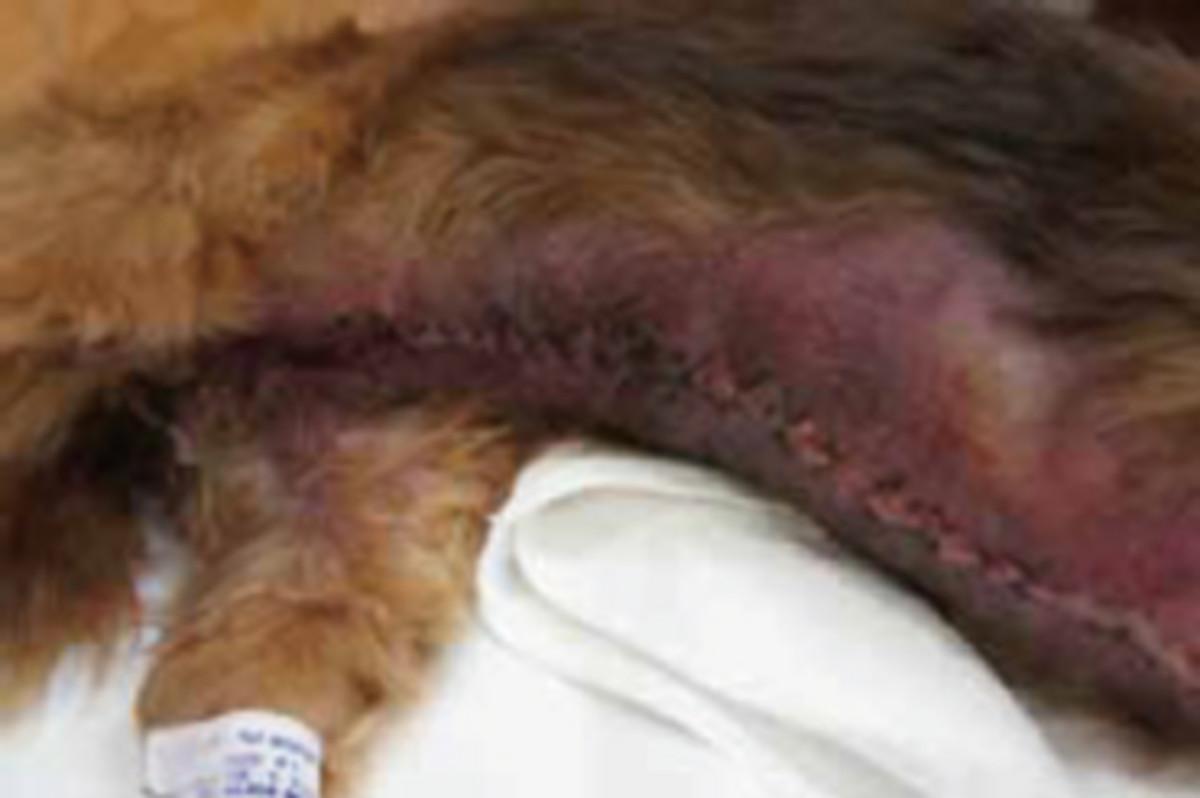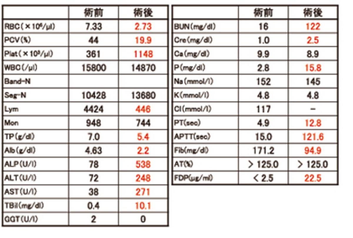 手術中の出血も通常範囲内で,問題なく右側乳腺片側摘出術を終了しました.術後の覚醒も順調でしたが,翌日の身体検査にて術部周囲の広範囲な出血(図1)と,貧血が確認されました.直ちに,止血剤とデスモプレシンの投与ならびに新鮮全血の輸血を実施しました.手術2日後には下腹部に疼痛が認められるようになり,同様の処置を継続しましたが貧血ならびに出血傾向は改善せず,血液凝固線溶系検査にも異常を認められるようになりました.新鮮凍結血漿(FFP)の投与を実施しましたが,低血圧,乏尿状態と悪化し,術後6日目に死亡しました.表1に手術前後の血液所見を示します.また,図2に赤血球数,PCV値の時系列と治療歴を示します.