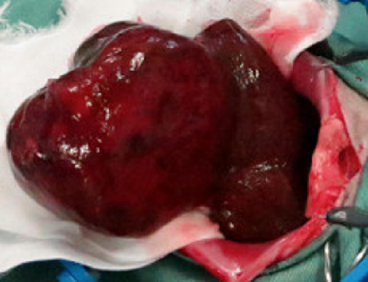 症例に全身麻酔を施した後、上腹部を正中切開し、腫瘍を露出しました(図11)。サージカルマージンを確保し、肝右葉の部分切除を行うことで腫瘍を切除しました。手術時間はおよそ60分でした。腫瘍切除後は血糖値が上昇しましたので、グルコース流量を0.1 g/kg/hrに減じて維持しました。術後も同様に血糖値をモニタリングしながら、グルコース流量を調整し維持しました(図12)。退院後、低血糖は消失しました。切除した腫瘤は病理組織学的に肝細胞癌と診断され、腫瘍切除後は低血糖が改善しましたので、術前に認められた低血糖は腫瘍からのインスリン様成長因子が原因であったと推察されます。