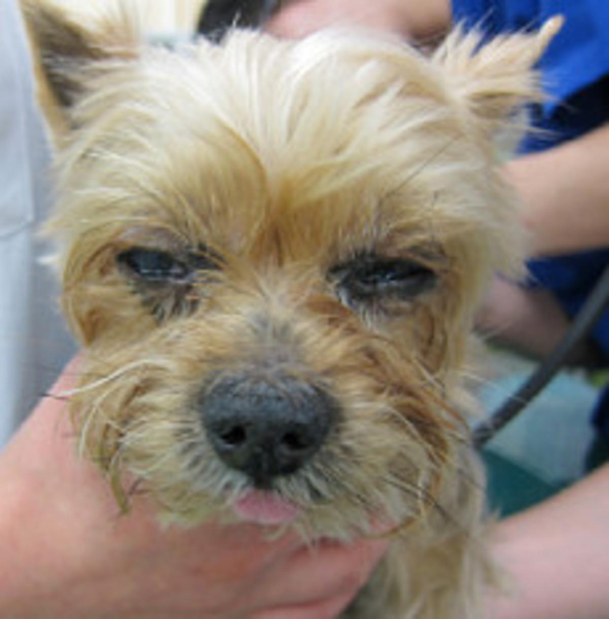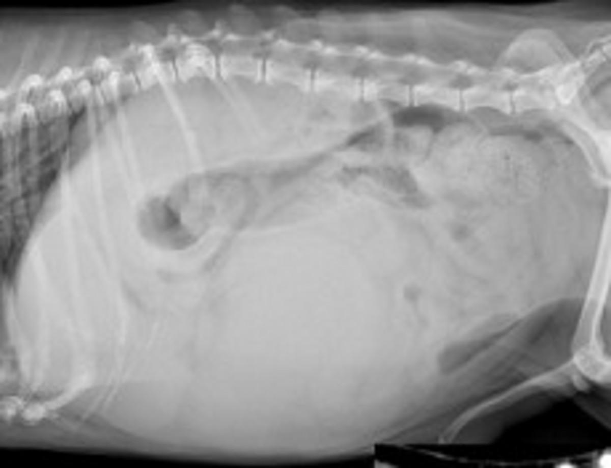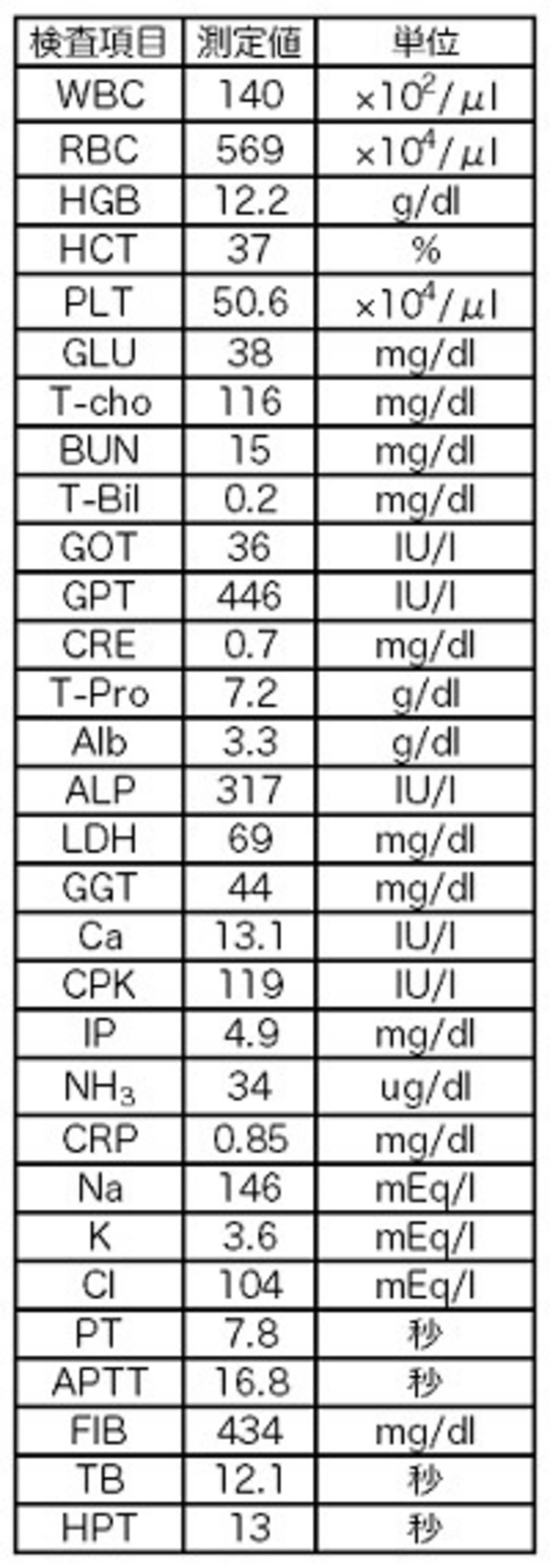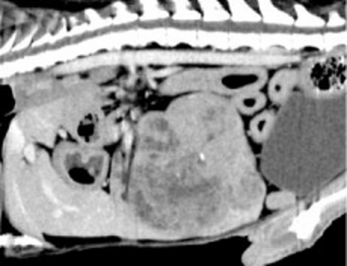 ヨークシャーテリア、未去勢雄、12歳、体重3.4 kg(BCS3/5)です(図8)。両眼の羞明を主訴に近医を受診し、その時の検査にて肝臓に腫瘤が見つかったため、肝臓腫瘤に対する精査および治療を求めて紹介受診しました。初診時の血液検査では、低血糖およびGPTの上昇が認められました(表3)。X線検査および超音波検査にて肝右葉に腫瘤が認められたため(図9)、CT検査を実施しました。CT検査では肝右葉から突出し、周囲肝組織と比較して低吸収を示す腫瘤(6.0×6.0×7.9 cm)が孤立性に認められました(図10)。これら検査所見や造影剤による染色性から肝右葉に主座する孤立性の肝細胞癌が疑われました。また、肝腫瘍以外に低血糖の原因となる異常が認められなかったため、低血糖は腫瘍随伴症候群であることが疑われました。肝腫瘤は外科的に完全切除が可能と考えられたため、開腹下で切除する計画としました。周術期の血糖管理については、先の門脈体循環シャントの症例とほぼ同様に計画しましたが、本症例では腫瘍切除後、腫瘍からのインスリン様成長因子の分泌がなくなることから、高血糖になることが想定されましたので、腫瘍切除後は血糖値をモニターしながらグルコースの輸液を減じることを予定しました。