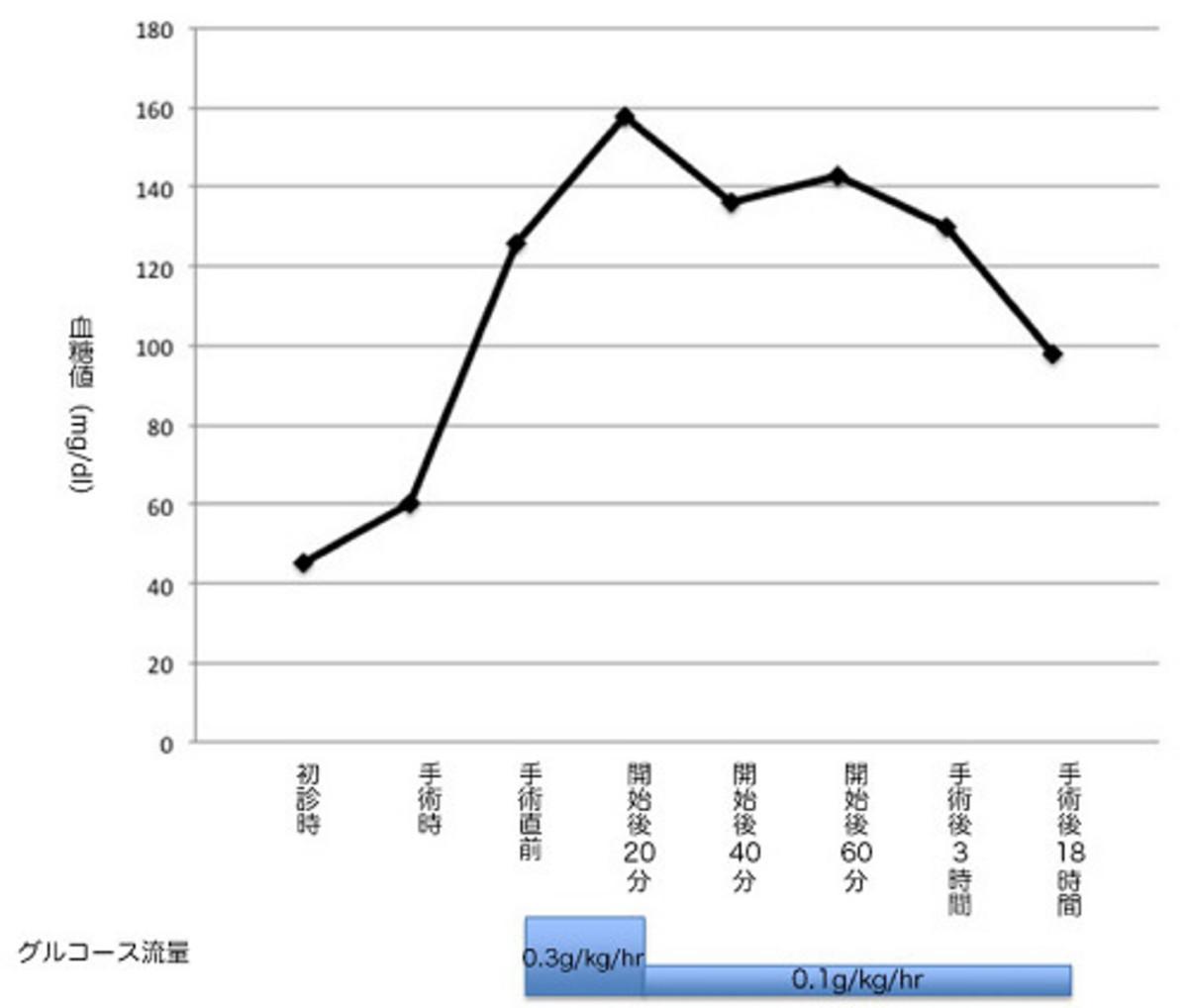 手術当日の血糖値は33 mg/dlと重度低血糖でしたので、20 %グルコースのボーラス投与ならびに術前に7.5 %糖加乳酸リンゲル液の静脈点滴により血糖値を補正しました。手術直前の血糖値は117 mg/dlでした。手術開始時はグルコース添加酢酸リンゲル液(10 ml/kg/hr、グルコース流量は0.3 g/kg/hr)にて輸液を行い、血糖値をモニターしながらグルコースの添加量を調整することとしました。