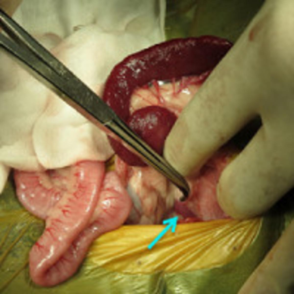 症例に全身麻酔を施した後、上腹部を正中切開し、腸間膜静脈にカニュレーション後、門脈圧の測定および門脈造影(図3)を行いました。シャント血管を同定し(図4)、仮結紮後に門脈圧測定および門脈造影(図5)を実施したところ、門脈圧の上昇が認められたため、門脈圧が過度に上昇しない程度に部分結紮にとどめ、手術を終了しました。手術時間は約60分でした。これらの手術中、約20分おきに血糖値をモニタリングしました(図6)。手術開始20分後で血糖値が158 mg/dlに上昇していましたので、グルコースの流量を0.1 g/kg/hrに減量しました。手術開始後40分では136 mg/kg/dlでしたので、この流量のまま手術終了まで維持しました。手術終了後も血糖値をモニターしながら、輸液中のグルコース濃度を調節して維持しました(図7)。