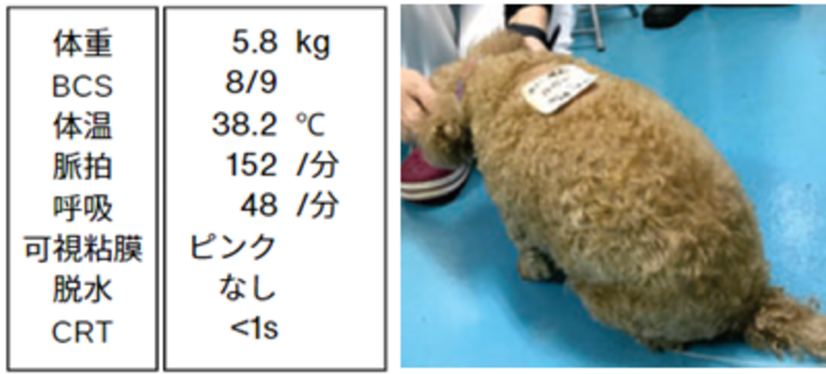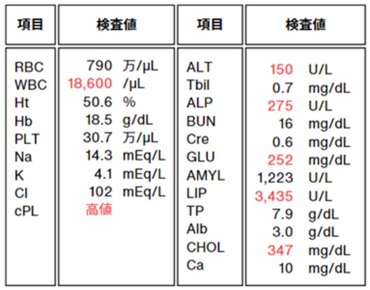 患者は、急性嘔吐があったためかかりつけ医を受診しました。マロピタントの皮下投与の治療を受け、それ以降、嘔吐は改善しました。しかし、元気・食欲は全くなかったため、翌朝に再度かかりつけ医を受診し、CBC検査と血液化学検査を実施したところ、WBC 18,600 /μL、LIP 3,435 U/L、CHOL 347 mg/dL、cPLが高値でした(表1)。また、超音波検査でも腹水貯留が見られ、膵炎が疑われたため、大学病院に紹介していただきました。