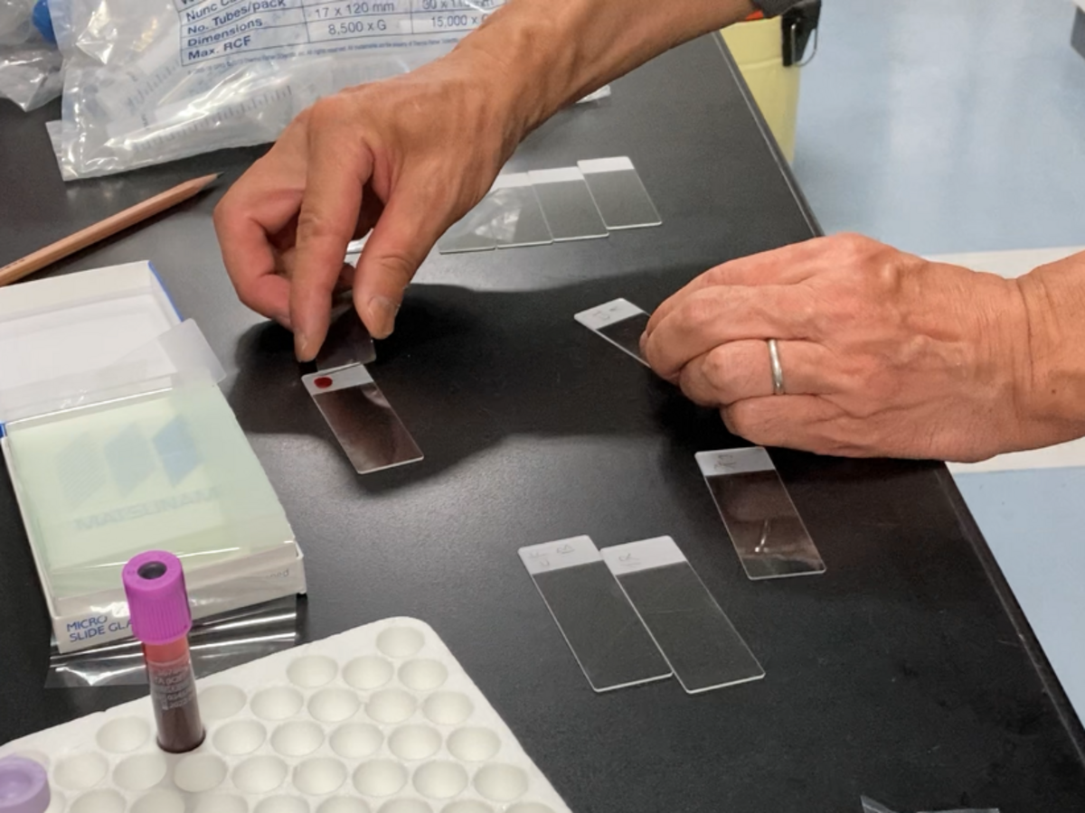 根尾櫻子先生(以下、根尾): 私はスライドガラスの端に血液を垂らして、そこから直接引き伸ばすことが多いです。