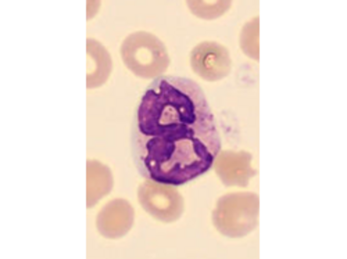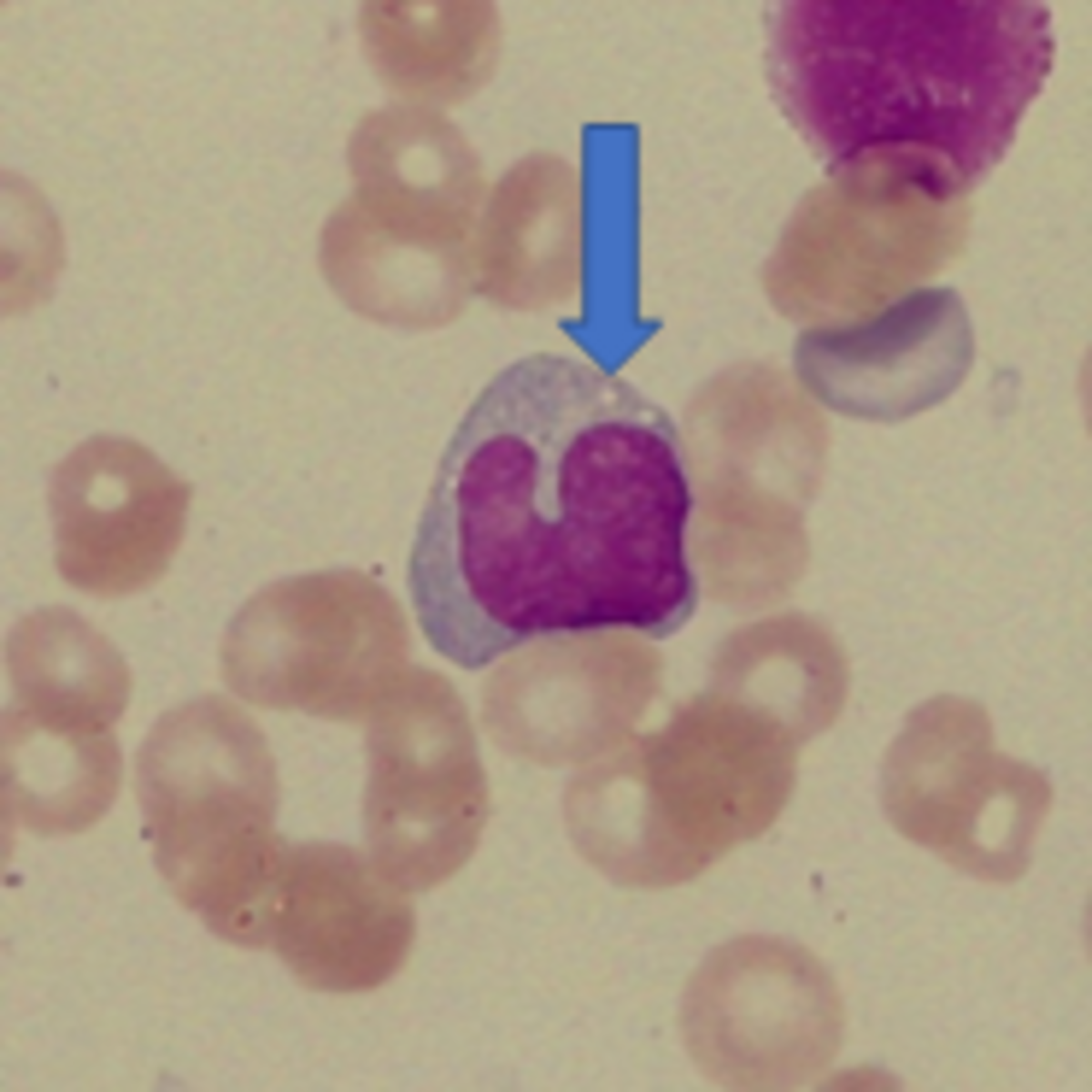 根尾:白血球の中で最も大きな細胞です。核は深く切れ込みが入っている場合や腎臓型や馬蹄型など様々な形態をとり、核内部はクロマチン凝集が少なく繊細です。細胞質は、メイ・ギムザ染色やライト・ギムザ染色では灰青色に染まり、空胞(図7、矢印部分)が見られることもあります。
