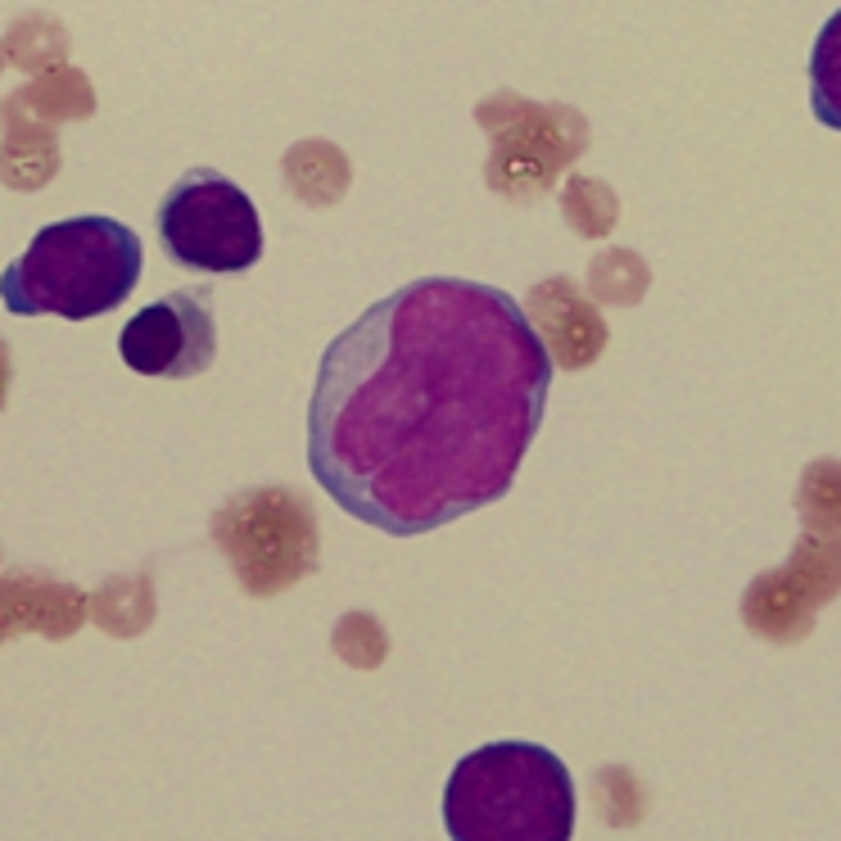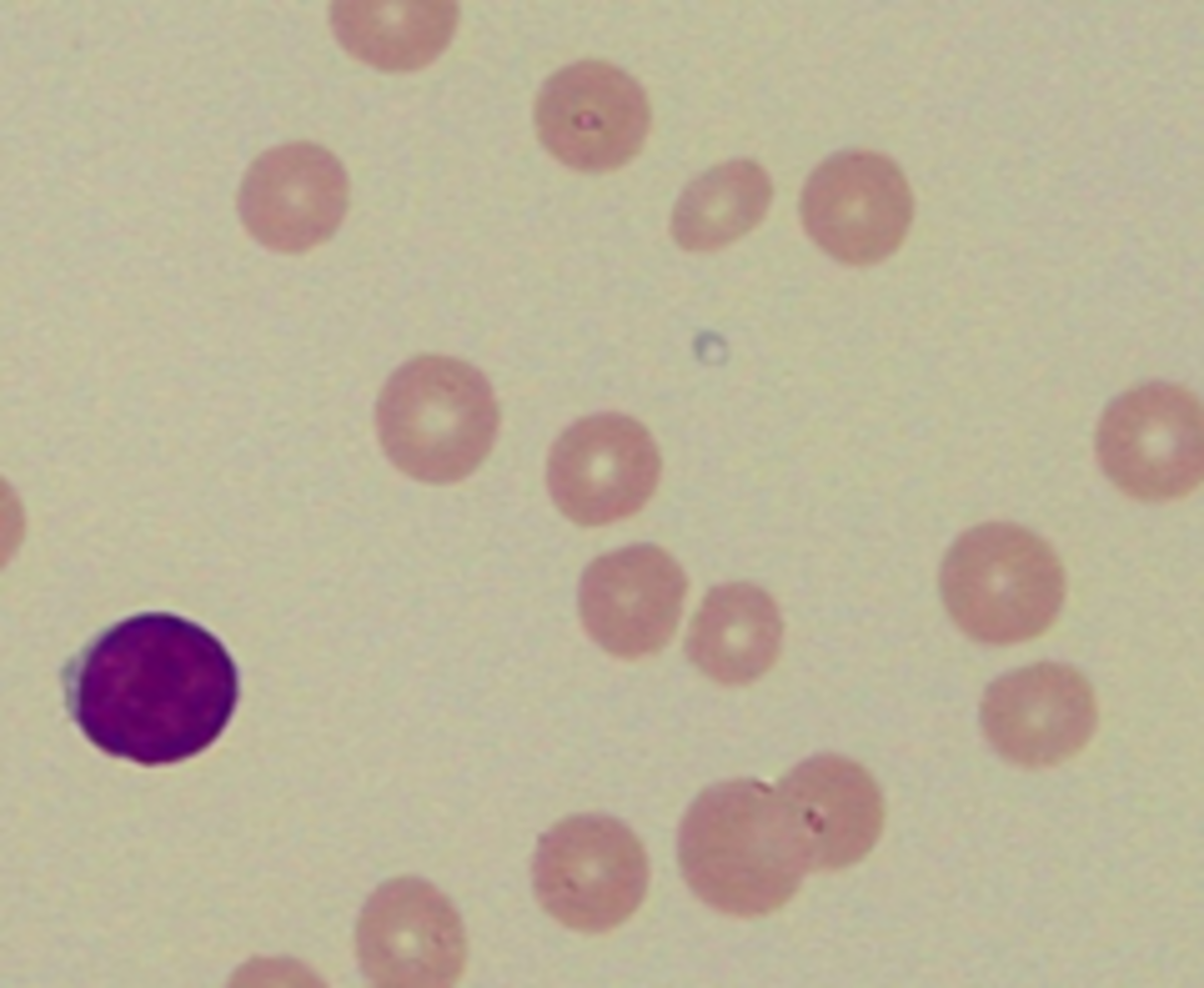 根尾:赤血球の1.5倍程度の大きさです。核が大きく、メイ・ギムザ染色やライト・ギムザ染色では濃い紫色に染まります。細胞質は狭く、核の周囲が明るく見える「核周明庭」と呼ばれる所見が観察されます。基本的には丸い形をしていますが、異型リンパ球など形の異なるものもあります。