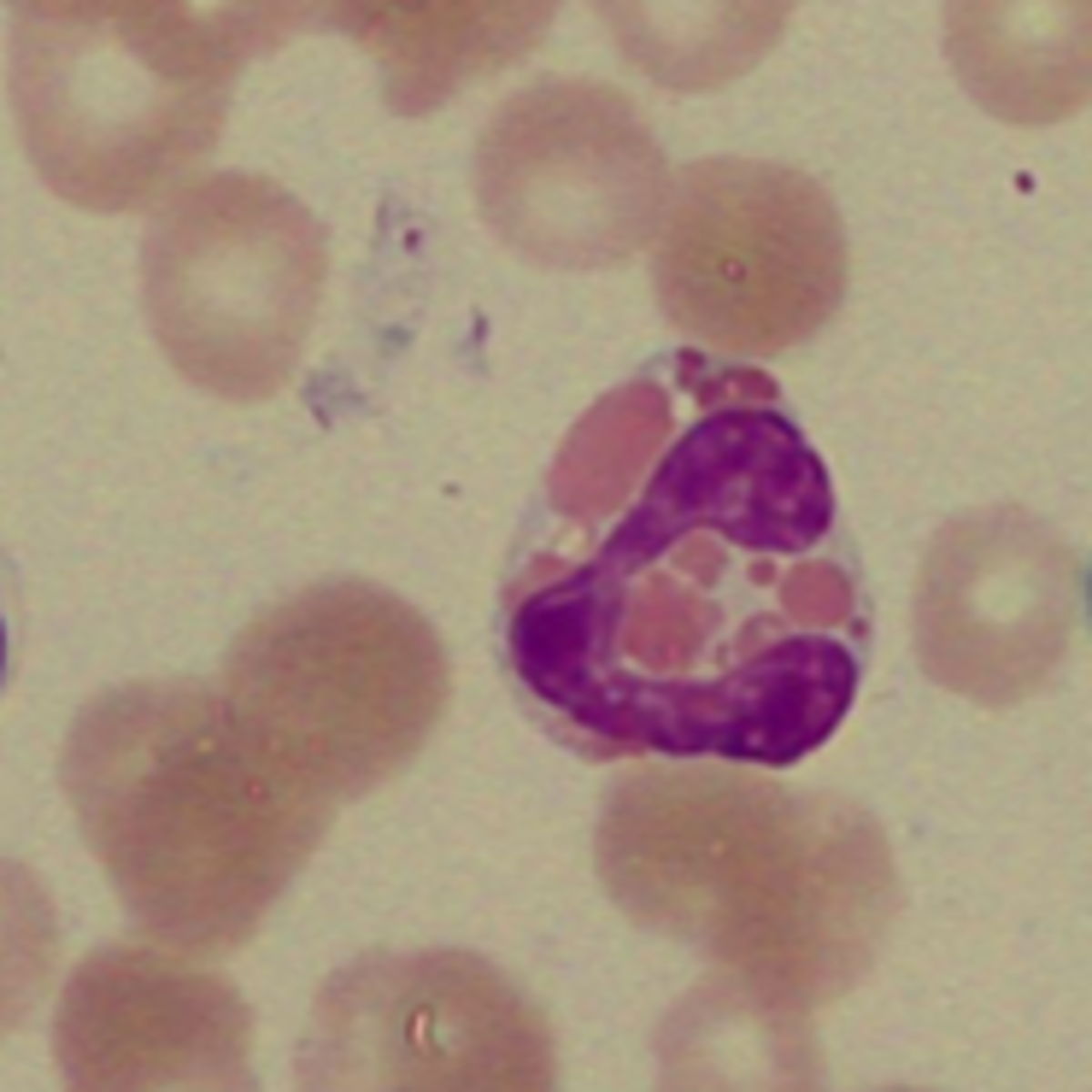 根尾:細胞質全体に好酸性の顆粒がみられる細胞です。メイ・ギムザ染色やライト・ギムザ染色では顆粒は桃色~橙黄色に染まります。核は好中球と同様に、経時的にくびれが生じ、分葉核となります。犬では大きめの顆粒が見られ(図9)、猫では均一な細かい顆粒が見られます(図10)。