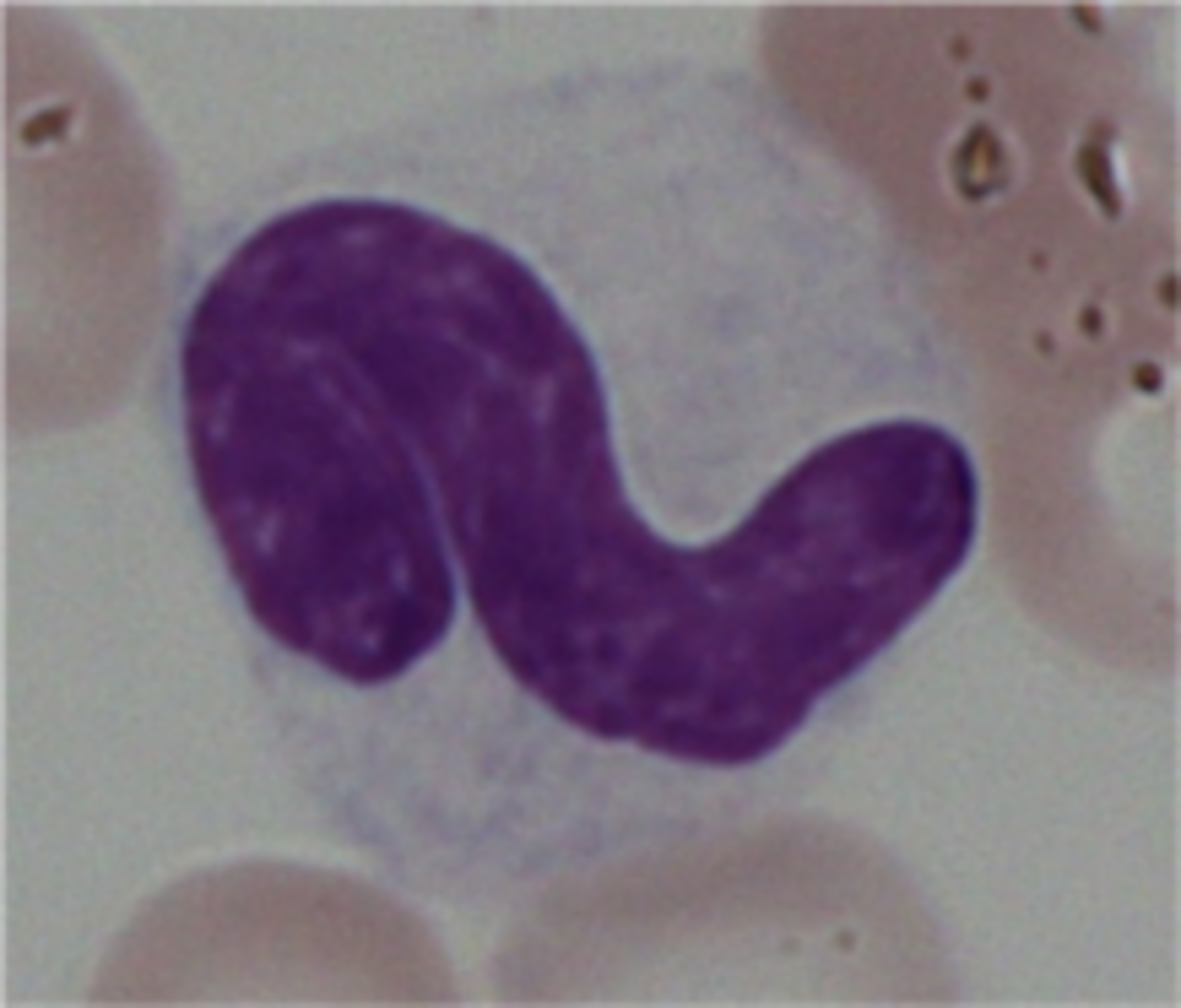 根尾櫻子先生(以下、根尾):ヒトでは細胞質内に好中性顆粒が観察できることから、好中球と呼ばれますが、犬や猫では顆粒はあまり顕著ではありません。若い細胞では核が桿状を示し桿状核球と呼ばれますが、次第に核にくびれが生じ、分葉核球となります。くびれの判断は「核の幅の最大直径の1/2以下の幅の部分があれば、くびれとする*1」とされています。