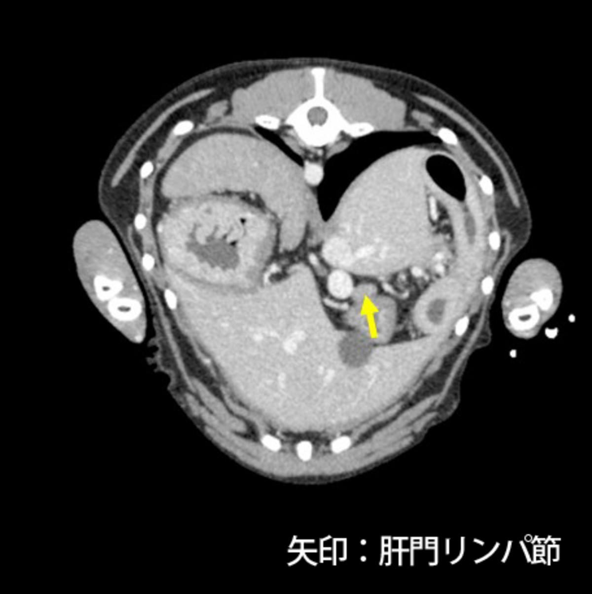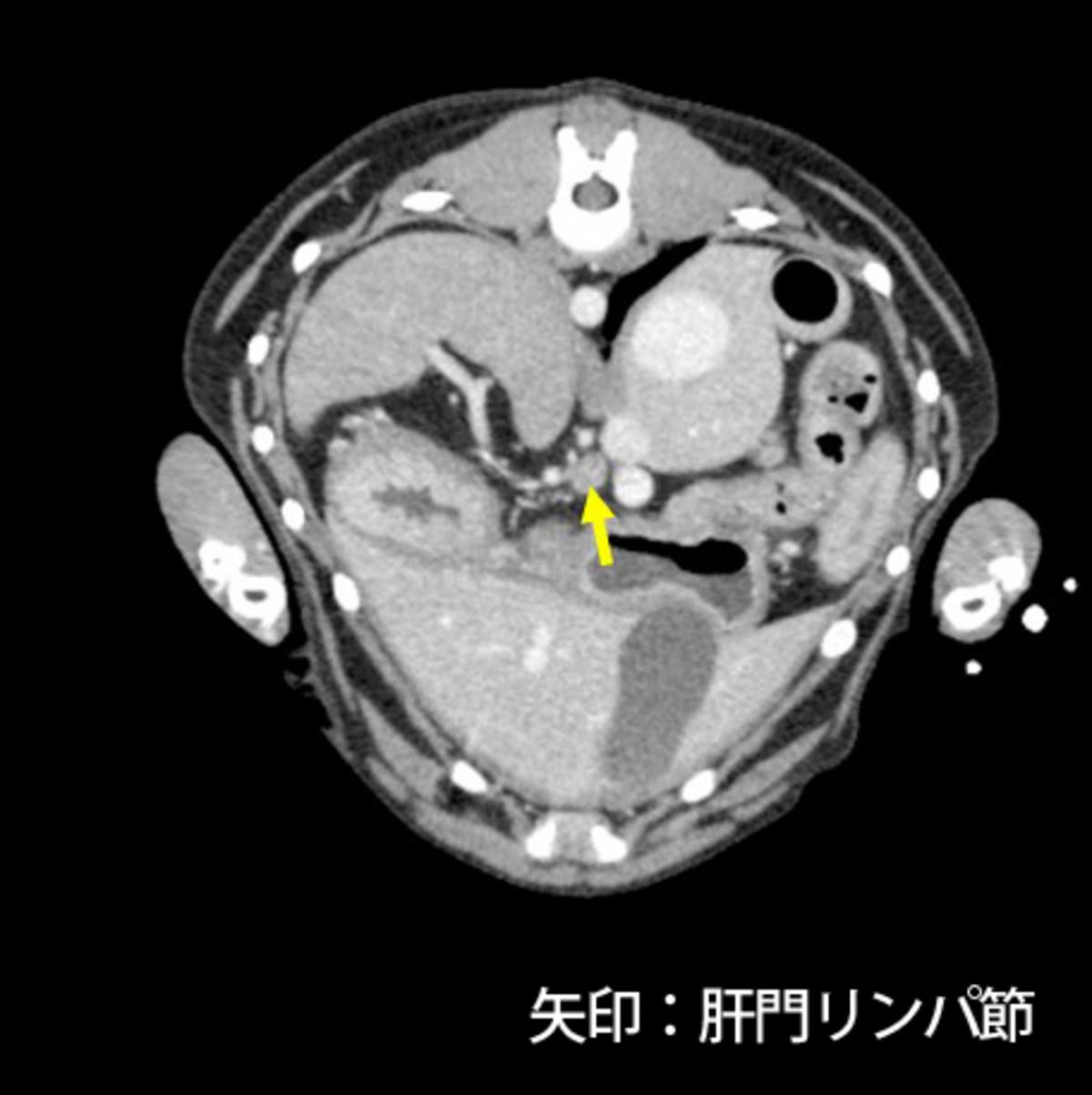 症例はバセンジー、去勢雄、11歳8ヵ月齢、10.5kgです。当院初診の一月前にふらつきを認め近医を受診し、低血糖(38mg/dL)、インスリン高値が認められたためインスリノーマと仮診断され、少量頻回の食事と糖液の投与により一般状態を維持していました。初診時の血液検査では血糖値は正常であり、CT検査にて膵臓右葉尾側に腫瘤(15×10×10mm)、肝臓外側左葉の腫瘤(5mm大×2)、肝門リンパ節腫大(12×10×6mm、15×9×7mm)が認められました(図1)。肝臓への転移が疑われるため、根治は難しい可能性が高いものの臨床症状およびQOLの改善を目的とした手術が予定されました。