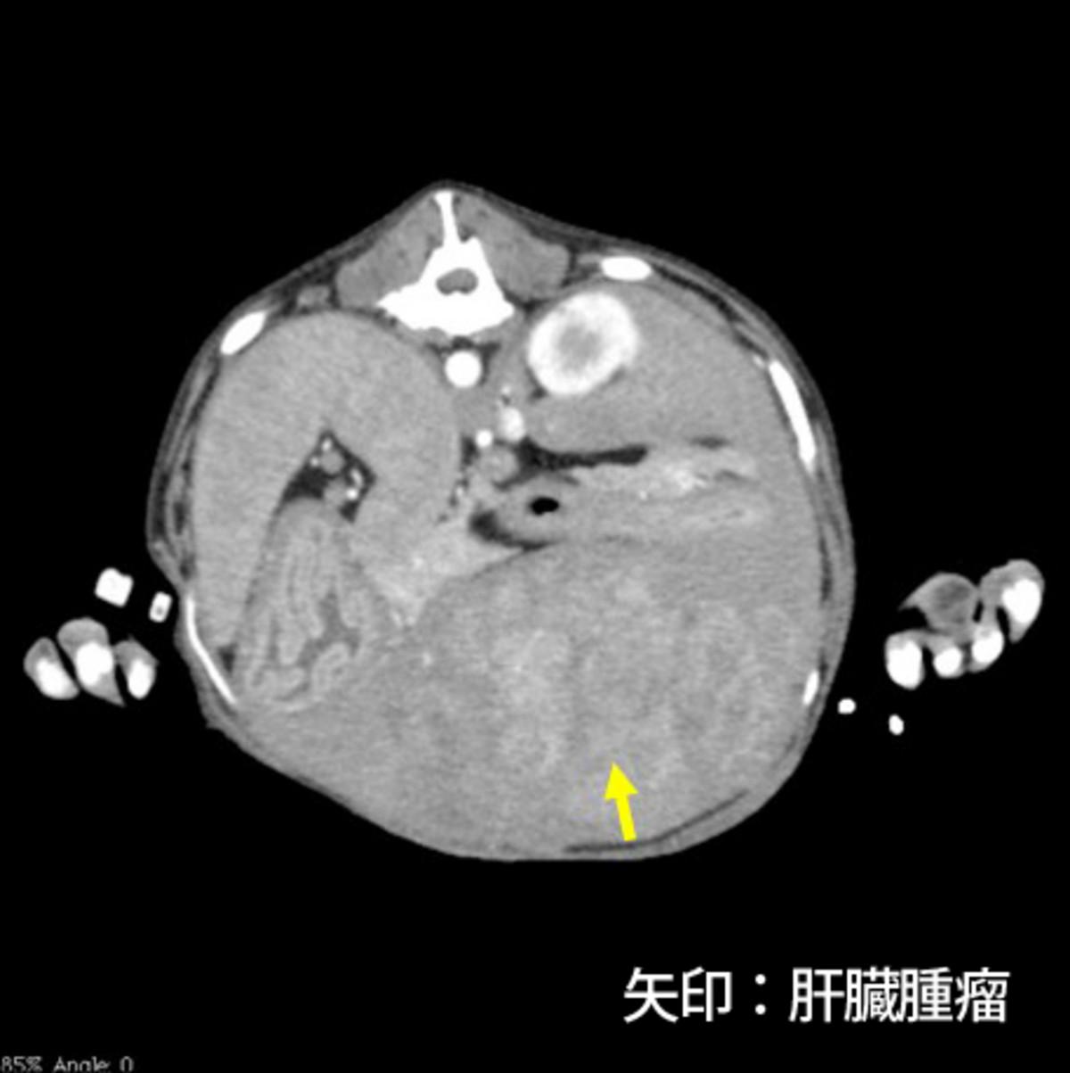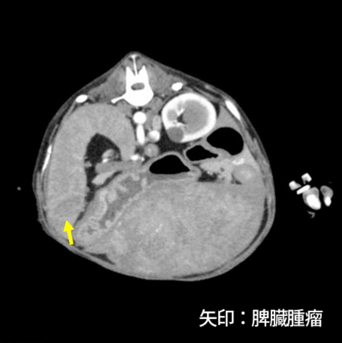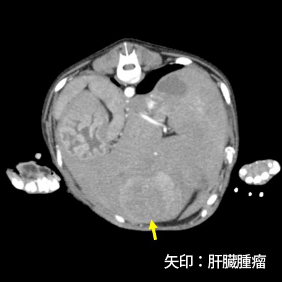 症例はミニチュア・ダックスフント、避妊雌、12歳11ヵ月齢、5.2kgです。当院初診の20日前に痙攣、失禁、意識の低下が5分ほど持続し、近医を受診しています。院内の検査にて低血糖(41mg/dL)、インスリンの低値、肝臓腫瘤を認め、ACTH刺激試験の結果から副腎皮質機能低下症は除外され、頻回の食事と糖液の投与により一般状態を維持していました。初診時の血液検査では低血糖(36mg/dL)および肝臓内側左葉に腫瘤を認め、糖液を経口投与してからCT検査を行いました。CT検査では肝臓の内側左葉(長径90mm)、外側左葉、尾状葉に多発性の腫瘤を認め、脾臓にも腫瘤(長径15mm)を認めました(図3)。肝臓原発の腫瘍および腫瘍に随伴する低血糖と診断し、根治は不可能であるものの臨床症状およびQOLの改善を目的とした手術が予定されました。
