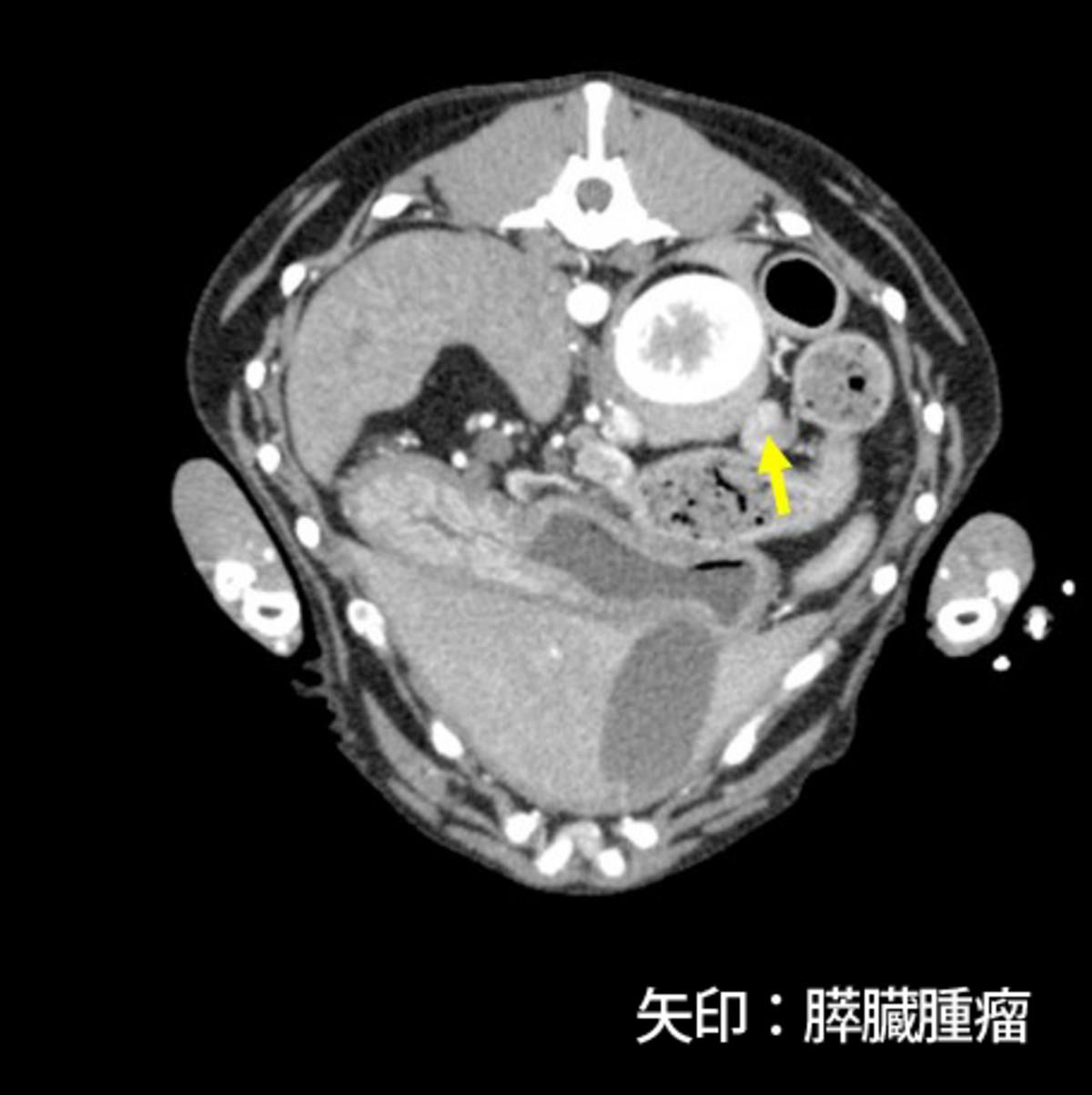インスリノーマは膵臓のβ細胞に生じる機能性腫瘍であり、血糖値に依らずインスリンが分泌されて低血糖が生じます。低血糖およびインスリン分泌に対する内分泌反応により、震え、発作、運動失調、虚脱などの臨床症状が生じますが、低血糖が重篤になると致命的です。腫瘍が原発巣のみあるいは局所的な転移にとどまり切除可能な場合には手術適応となり、症状の改善や予後の延長が期待できます。
