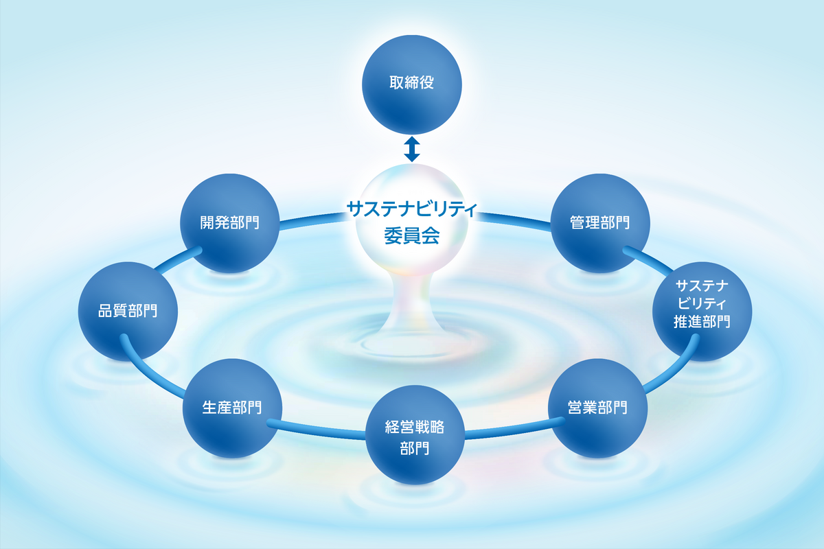 サステナビリティ委員会では、取締役、各部門の責任者、サステナビリティ推進室のメンバーを委員に任命し、サステナビリティ戦略の策定や活動報告、マテリアリティ(重要課題)の議論や審議を行っています。取締役からのトップダウンアプローチと、各部門からのボトムアップアプローチが相互に混ざりあい、部門横断的に連携しながら、目標達成に向けてサステナビリティ活動を推進しています。