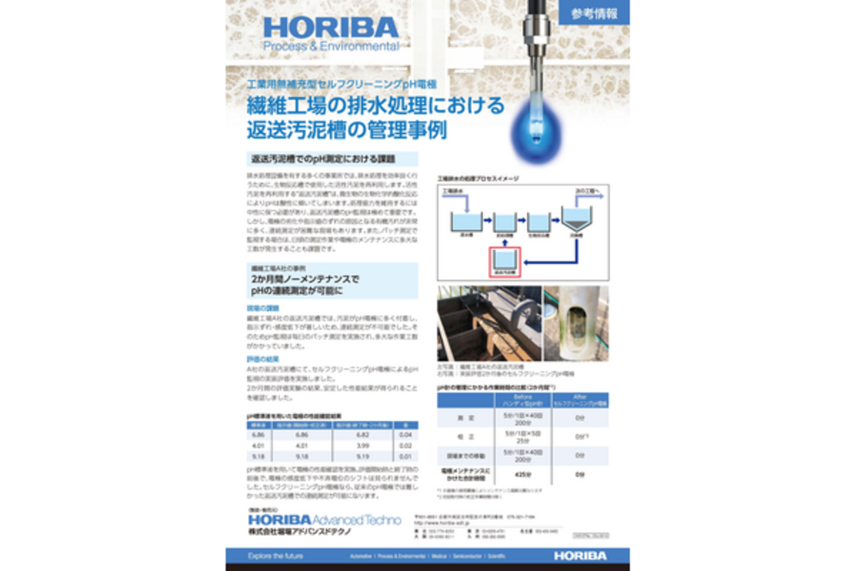 本記事では、セルフクリーニングpH電極6122シリーズを排水処理プロセスの返送汚泥槽に活用し、2か月間ノーメンテナンスで計測管理を実現※した繊維工場での評価事例をご紹介します!