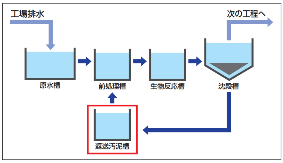 排水処理設備では、排水処理を効率良く行うために、生物反応槽で使用した活性汚泥を再利用します(下図参照)。活性汚泥を再利用する“返送汚泥槽”は、微生物の生物化学的酸化反応によりpHが酸性に傾いてしまいます。処理能力を維持するには中性に保つ必要があり、返送汚泥槽のpH監視は極めて重要です。