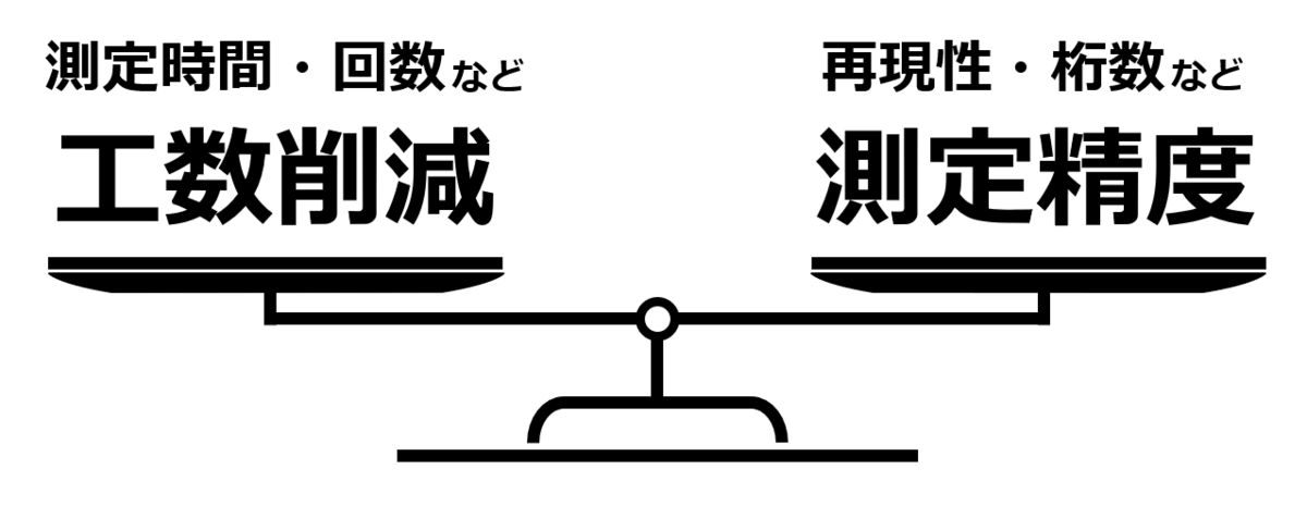 一方で測定精度を確保しようとすれば、再現性確認の回数を増やしたり、許容範囲を狭くする、桁数を増やす必要があり、結果として工数は増加します。