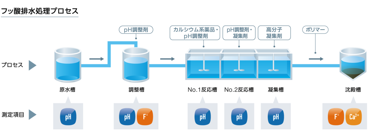カルシウム系薬品の注入量を適切に管理するためには、前段の調整槽でフッ化物イオン濃度をモニタリングすることが不可欠です。さらに、後段の沈殿槽でカルシウムイオン濃度をモニタリングすることで、カルシウム系薬品の注入量が妥当であったかを確認することができます。