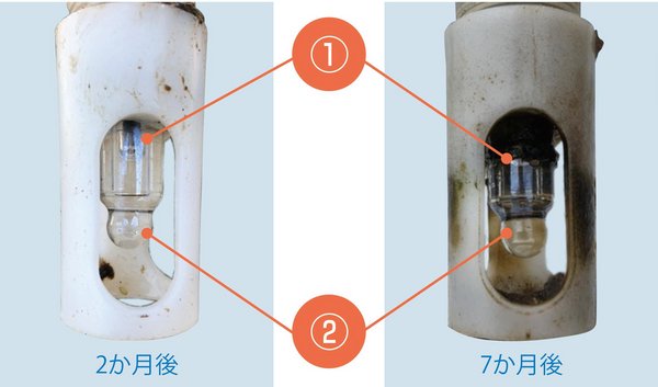 実装評価2か月後の電極と7か月後の電極を比較。未処理の①部分では汚れの付着が見られますが、TiO2コーティング処理を行っている②部分では7か月後でも汚れの付着が少ないことが確認できました。