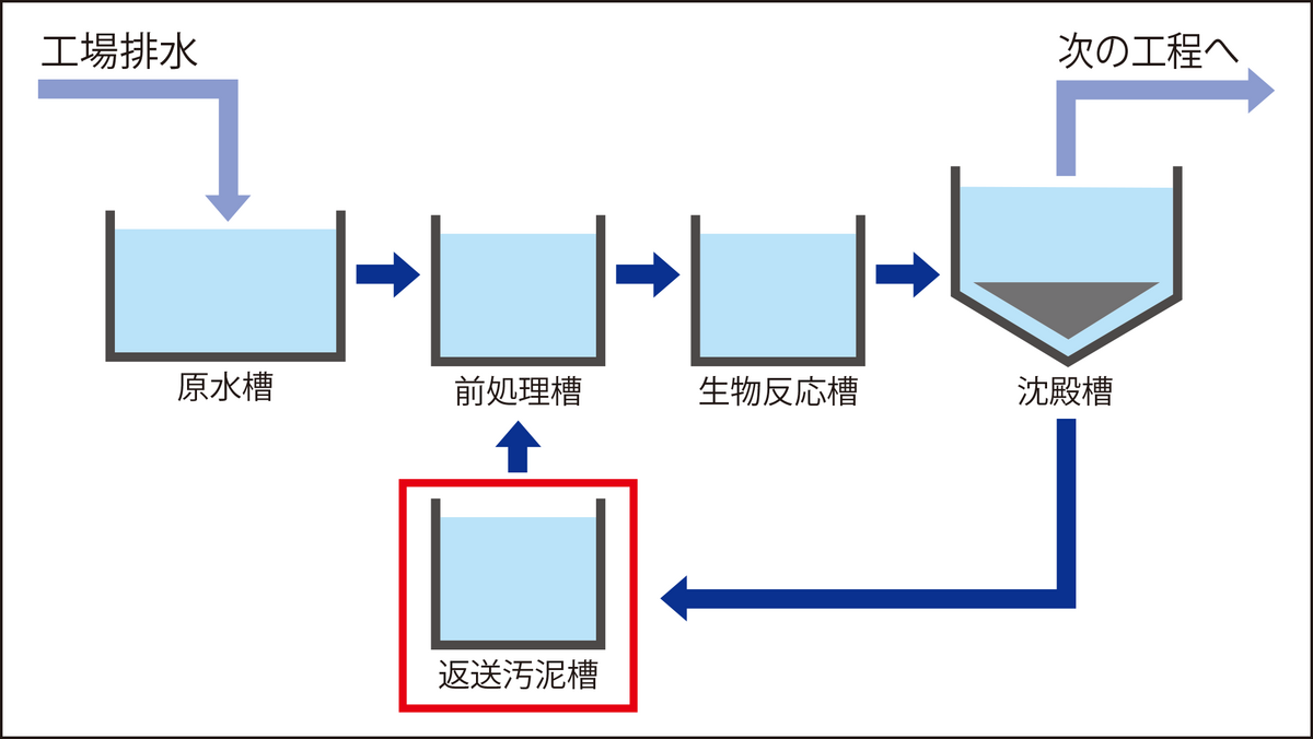 排水処理設備を有する多くの事業所では、排水処理を効率良く行うために、生物反応槽で使用した活性汚泥を再利用します。活性汚泥を再利用するための“返送汚泥槽”は、微生物の生物化学的酸化反応によりpHは酸性に傾いてしまいます。処理能力を維持するには中性に保つ必要があり、返送汚泥槽のpH監視は極めて重要です。