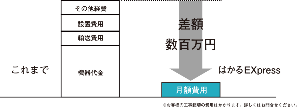 はかるEXpressは、計測器を購入する必要がなく月額費用のみでご利用いただけます。これにより初期投資の負担を大幅に軽減し、設備の運用をスムーズに始めることができます。