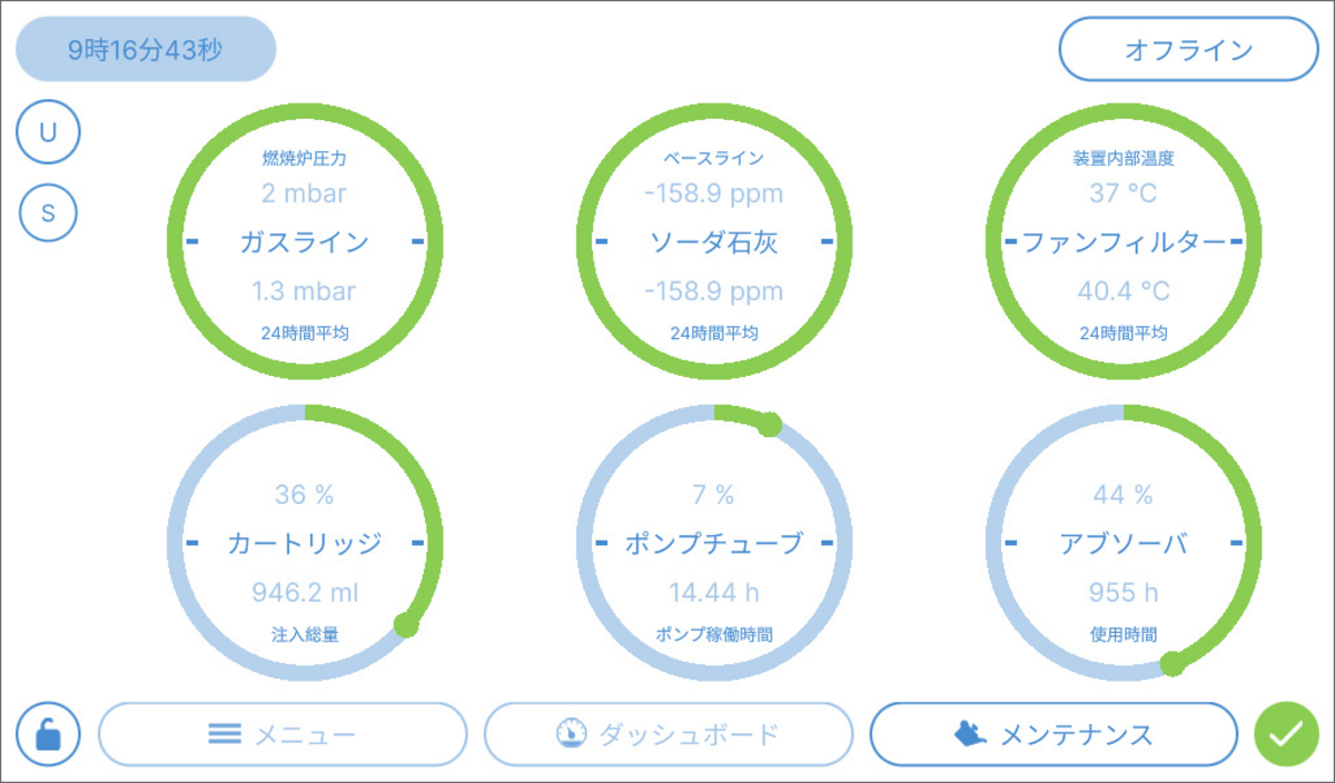 ※ 複数のセンサで燃焼炉などを自動的に監視し、メンテナンスや寿命に関するアラートを画面に色分けして表示します。 (正常=「緑」、軽度警報=「黄」、重度警報=「赤」)