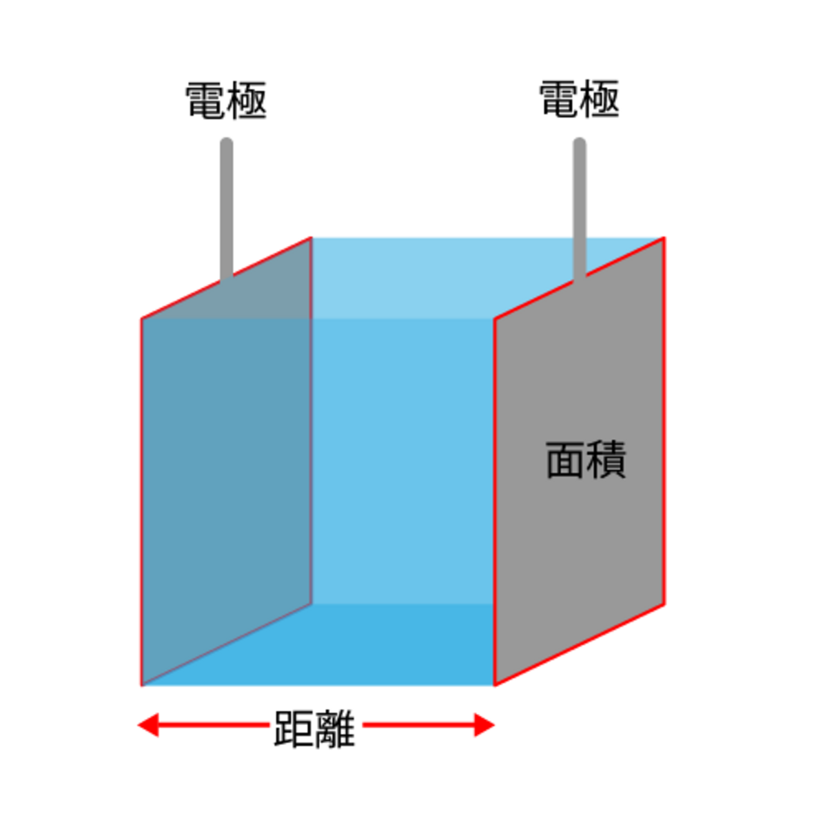 電気伝導率や電気抵抗率の測定では、溶液中に配置した電極の間に電圧を印加し溶液中を流れる電流の大きさから電気伝導度や電気抵抗率を測定します。このとき、二つの電極の面積と距離を決めることで、流れる電流が溶液の電気の通しやすさ(通しにくさ)によってどれぐらい変化しているかを正しく知ることができます。電極同士の間の空間をセルと言い、決められた電極の面積と距離でできる物理的な定数をセル定数と言います。