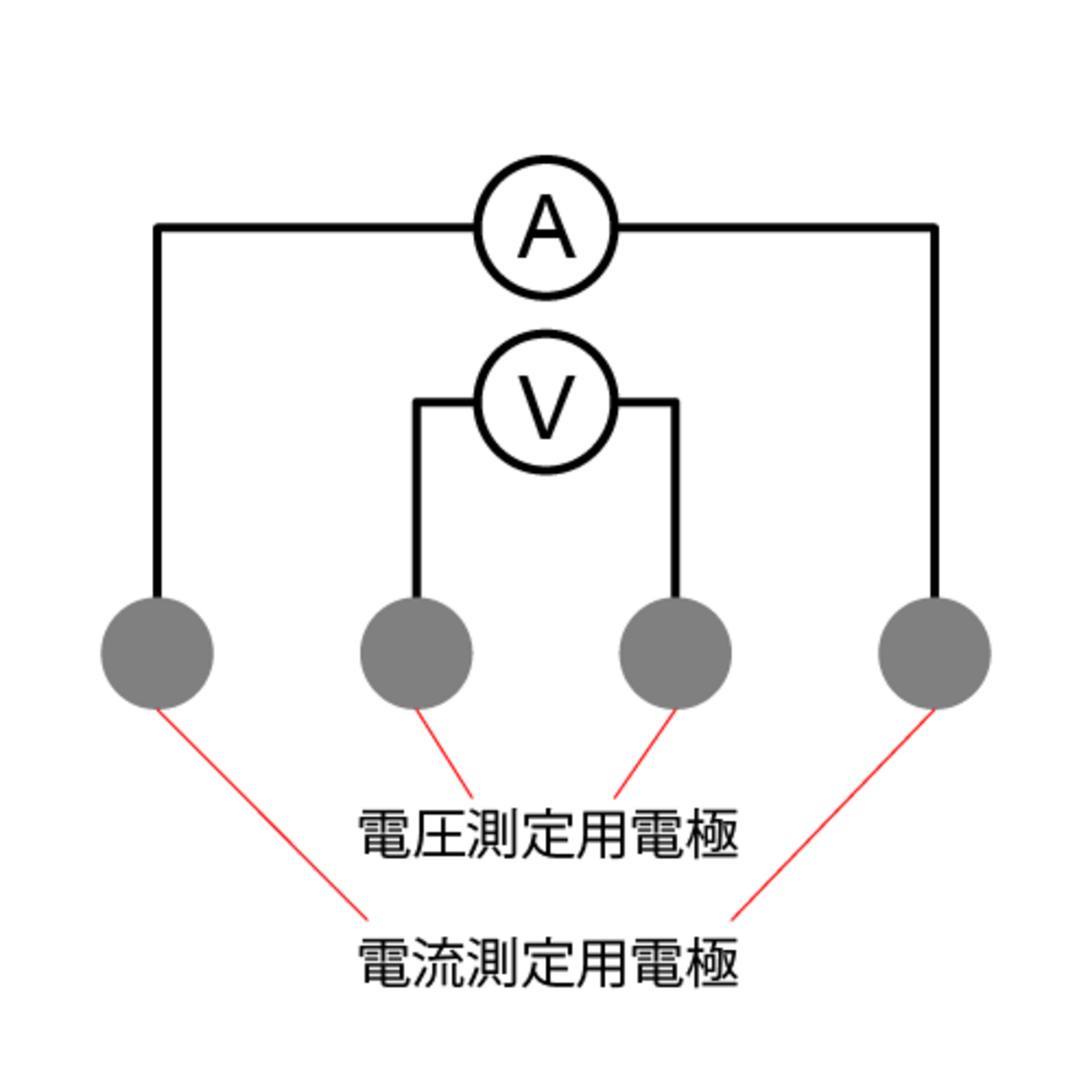 電気伝導率や電気抵抗率の測定では、溶液中に配置した電極の間に電圧を印加し溶液中を流れる電流の大きさから電気伝導率や電気抵抗率を測定します。このとき、溶液の電気伝導率が高くなると分極※の影響により電流値が直線的に上昇せず徐々に緩くなっていきます。4電極法では、電流を測定するための2つの電極の間に電圧を測定するための電極を2つ設置します。分極は主に外側の電流測定用極で発生するため、電流の測定に加え、この2つの電圧測定用極間の電圧により補正することで電気伝導率が高い溶液でも正確に測定することが可能です。