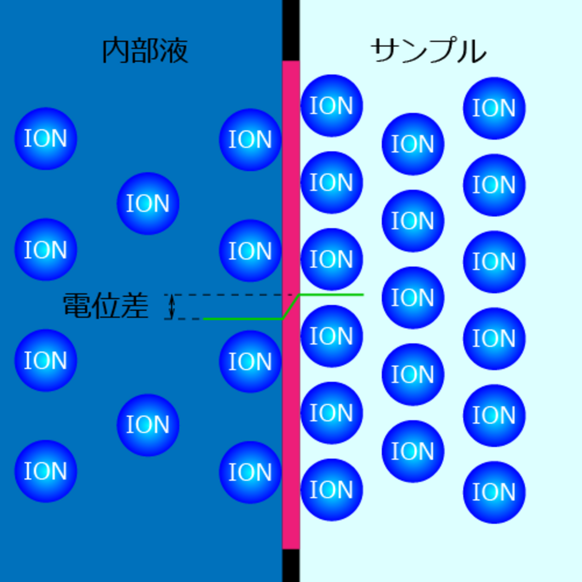 電位差測定法(イオン電極法)は、溶液中にイオン電極と比較電極をイオン選択応答膜で隔てて配置し、両極間の電位差を検出しイオン濃度を測定する方法です。比較電極は内部液(KCl)を中に配置し、内極の濃度を一定にして導通を得るために内部液が液絡部から溶液中に流出することで一定の電位を示し基準となります。イオン選択膜の内外で溶液のイオン濃度に応じた電位差が発生し、比較電極を用いることで電位差を測定できます。測定したいイオン種によってそれに適したイオン選択応答膜を用います。