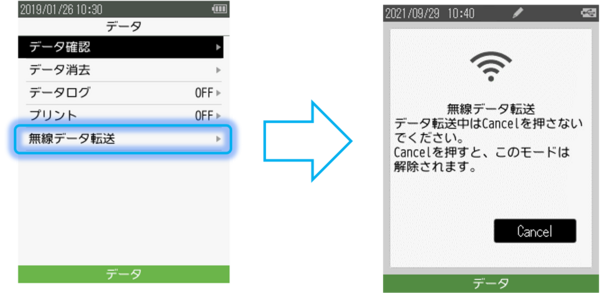 1. WQ-300のDATAキーを押し、無線データ転送を選択します。