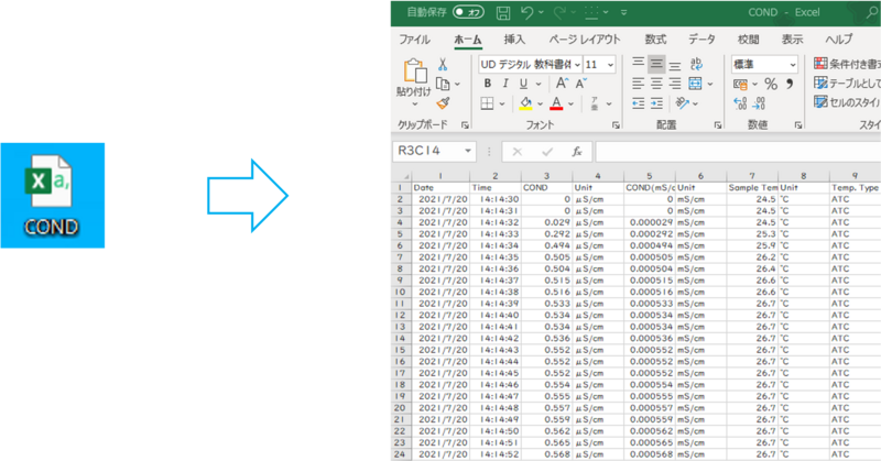 6. 保存したデータはExcelでテキストデータ(csvファイル)として開くことができます。