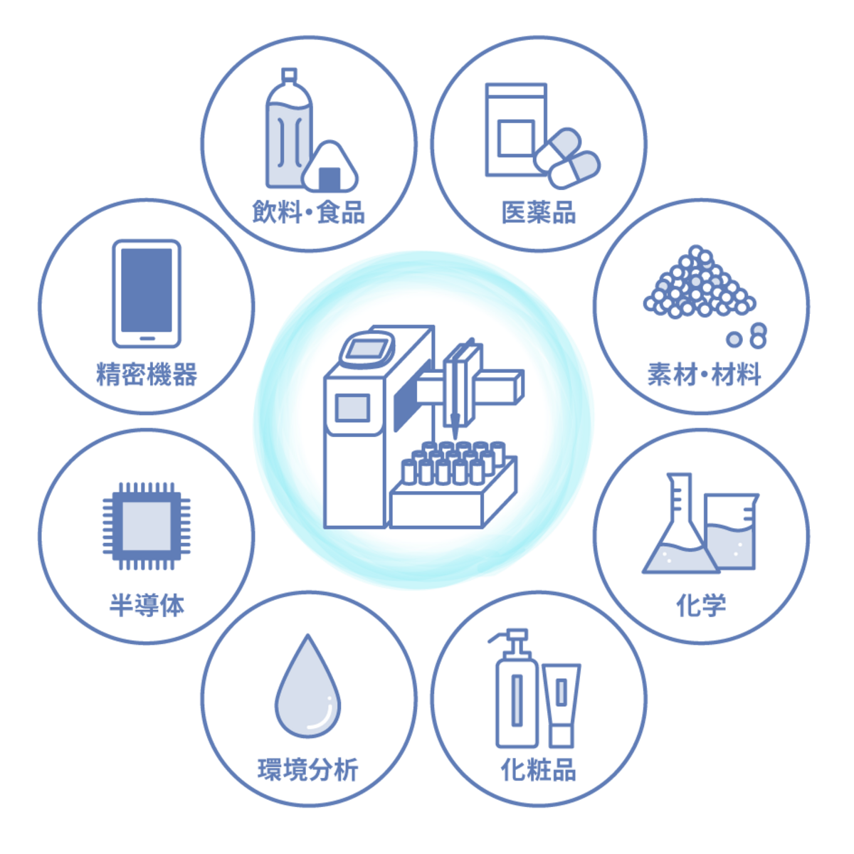 環境水(河、湖沼など)、製薬用水、水道水、工場排水、浄化槽処理水、クーラント液、CMPスラリー、インク、表面処理液、清涼飲料水、お茶、化粧品など