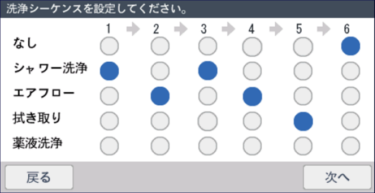 洗浄シーケンスは、順番や時間、回数などを自由に設定できます。例えば、シャワー洗浄を2回連続で実施したり、シャワー洗浄後にはエアフローを行うなど、多彩なカスタマイズが可能です。