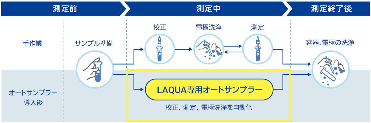 手分析では測定前の準備、測定、測定後の後片付けまでをすべて人が行う必要がありますが、オートサンプラーでは「校正」「電極洗浄」「測定」をすべて自動化できるため、手作業による作業工数を大幅に削減します。