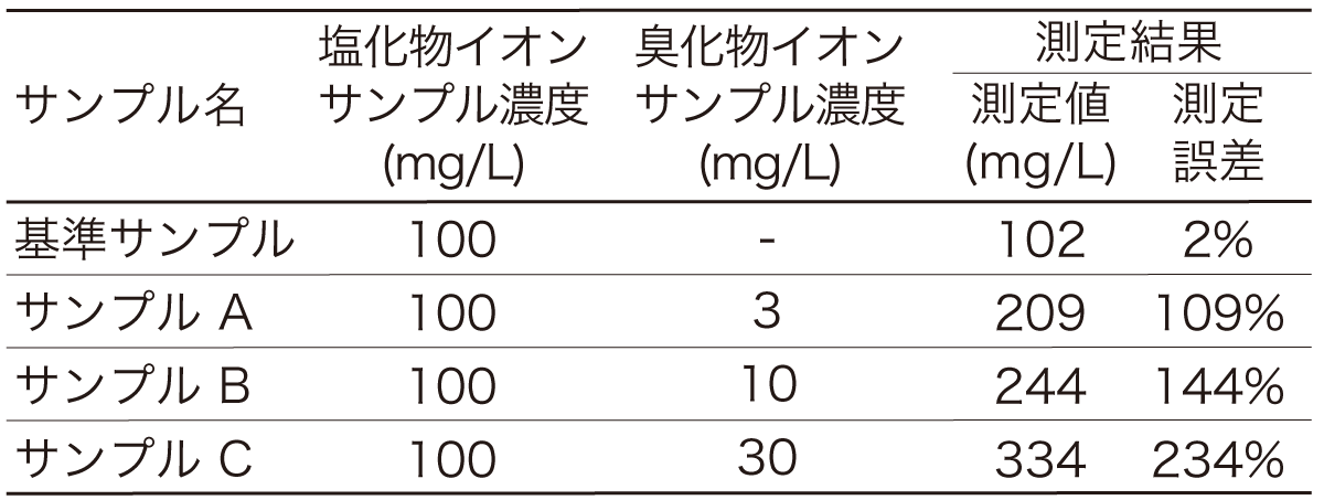以上のように、イオン電極法によるイオン測定においては、サンプル中に妨害イオンが含まれると測定誤差が大きくなることから、サンプル中の妨害イオンの有無に留意して測定することを推奨します。