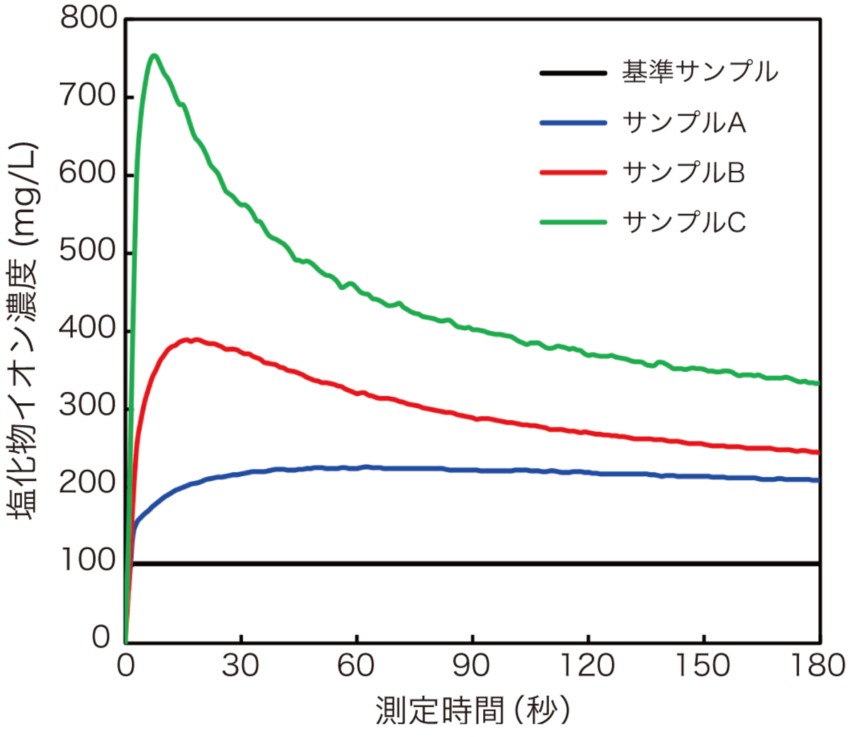 塩化物イオン標準液100 mg/Lと1000 mg/Lで校正し、基準サンプル(塩化物イオン濃度:100 mg/L)、サンプルA(塩化物イオン濃度:100 mg/L、臭化物イオン濃度:3 mg/L)、サンプルB(塩化物イオン濃度:100 mg/L、臭化物イオン濃度:10 mg/L)、サンプルC(塩化物イオン濃度:100 mg/L、臭化物イオン濃度:30 mg/L)を180秒間測定しました※1,2。