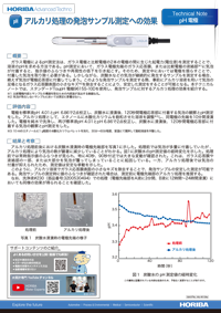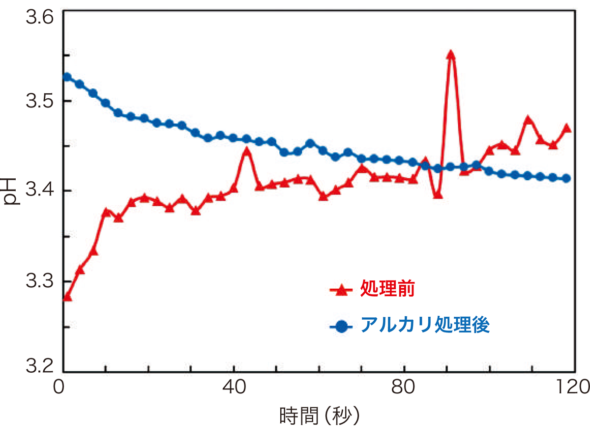 図1に炭酸水のpH測定値の経時変化を示しました。処理前では常時指示値のふらつきが見られ、特に40秒、90秒付近では大きな変動が確認されました。これはガラス応答膜や液絡部の一部、または大部分を気泡が覆ってしまっていることに起因しています。一方、アルカリ処理後では気泡の付着が抑えられたため、測定値は安定な挙動を示しました。