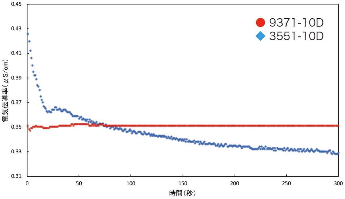 電極のエタノールへの浸漬時間と電気伝導率測定値の関係を図 1 に示しました。9371-10D の測定値を●で、3551-10D の測定値を◆で表しています。3551-10D は測定値が安定するまでに約5分を要していますが、9371-10D は浸漬後数十秒 で応答を完了していることが分かります。