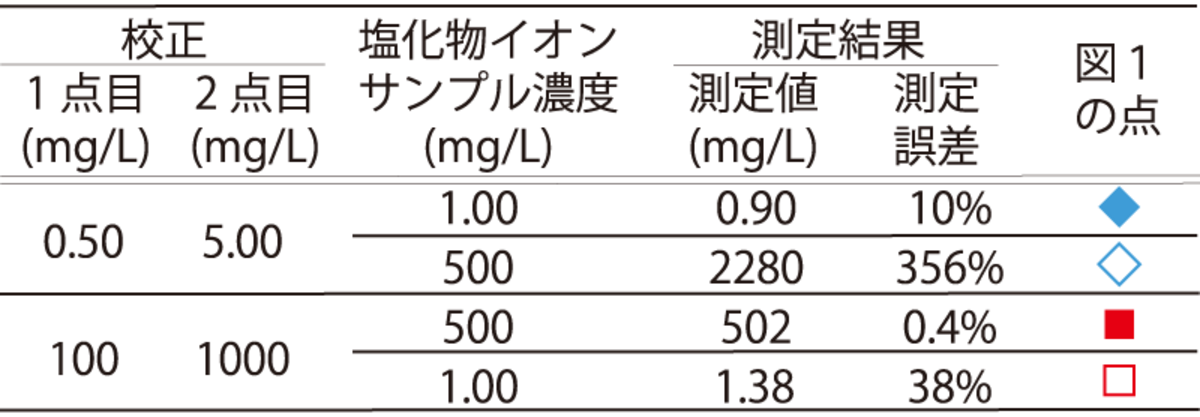 ② 500 mg/L の塩化物イオンサンプルに対して、挟み込むように校正できる 2 種の高濃度塩化物イオン標準液 100 mg/Lと 1000 mg/L にて校正し 500 mg/L の塩化物イオンサンプルを測定、または校正結果をそのまま使用し校正範囲を下回るイオン濃度のサンプル 1 mg/L を測定しました※1。