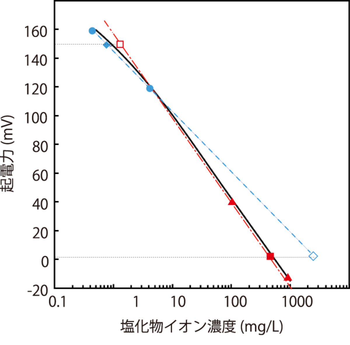 黒線は塩化物イオン電極の塩化物イオン濃度に対する電位応答の推定挙動を示します。この電位応答挙動は 5 mg/L を下回る付近から電位応答を曲がり始め、直線では無くなります。 そのため、低濃度校正における検量線 (破線) は高濃度側で、高濃度校正における検量線 (1 点鎖線) は低濃度側で黒線で示す塩化物イオン電極の塩化物イオン濃度に対する電位応答挙動よりズレが大きくなるため、サンプルの測定値を挟み込まない校正をした場合の測定値は大きな誤差が生じました。